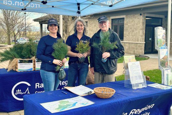 From left: SNC Communications Specialist, Erin Thorne; RRCA Administrative Assistant, Josianne Sabourin; and local resident, Ray Beauregard, at a 2024 Tree Giveaway event at the South Stormont municipal office.