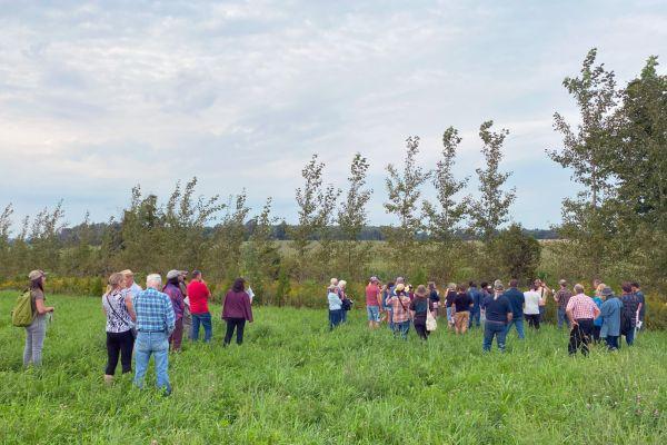 Participants at an RRCA farm stewardship tour visit a recently established, multi-layered windbreak.