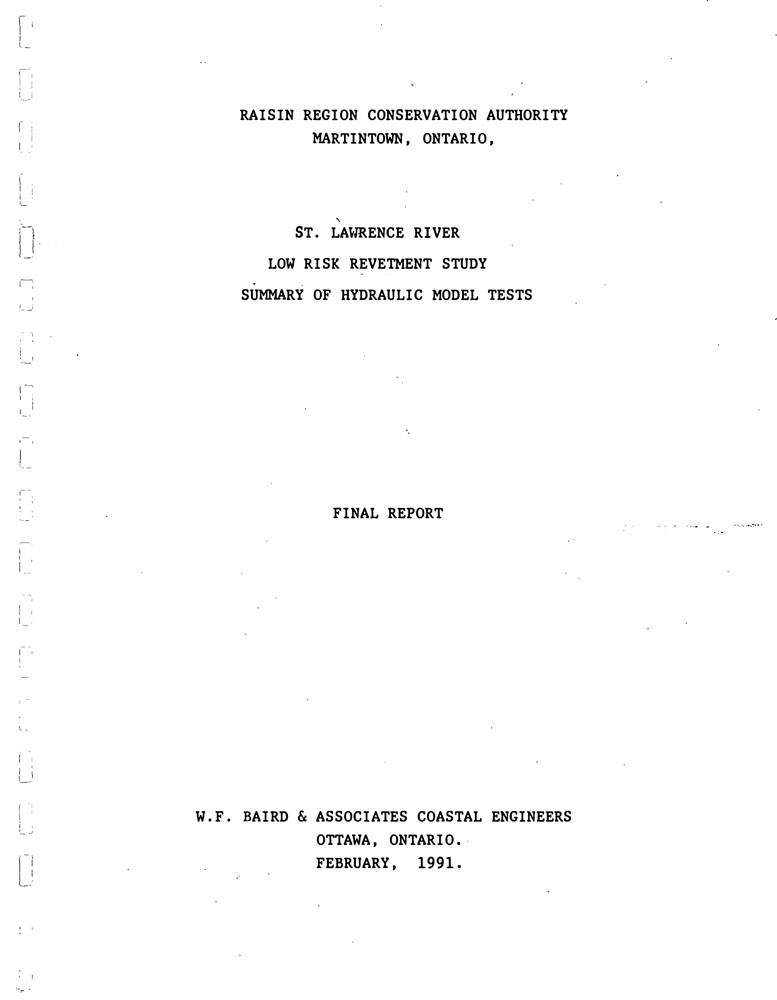 | 0007 | St. Lawrence River Low Risk Revetment StudySummary of Hydraulic Model Tests, Final Report | W.F. Baird and Associates Coastal Engineers | 1991 | Cerlox |