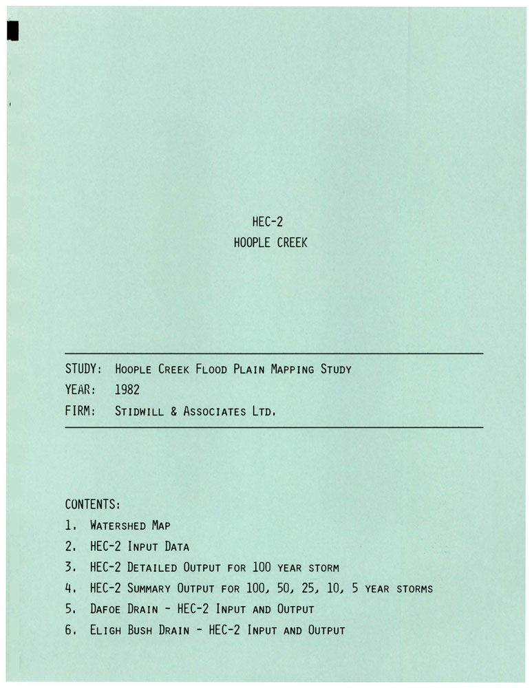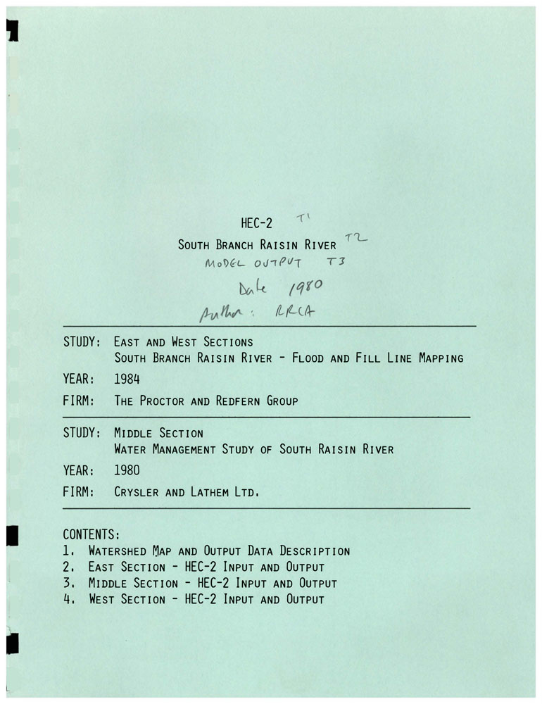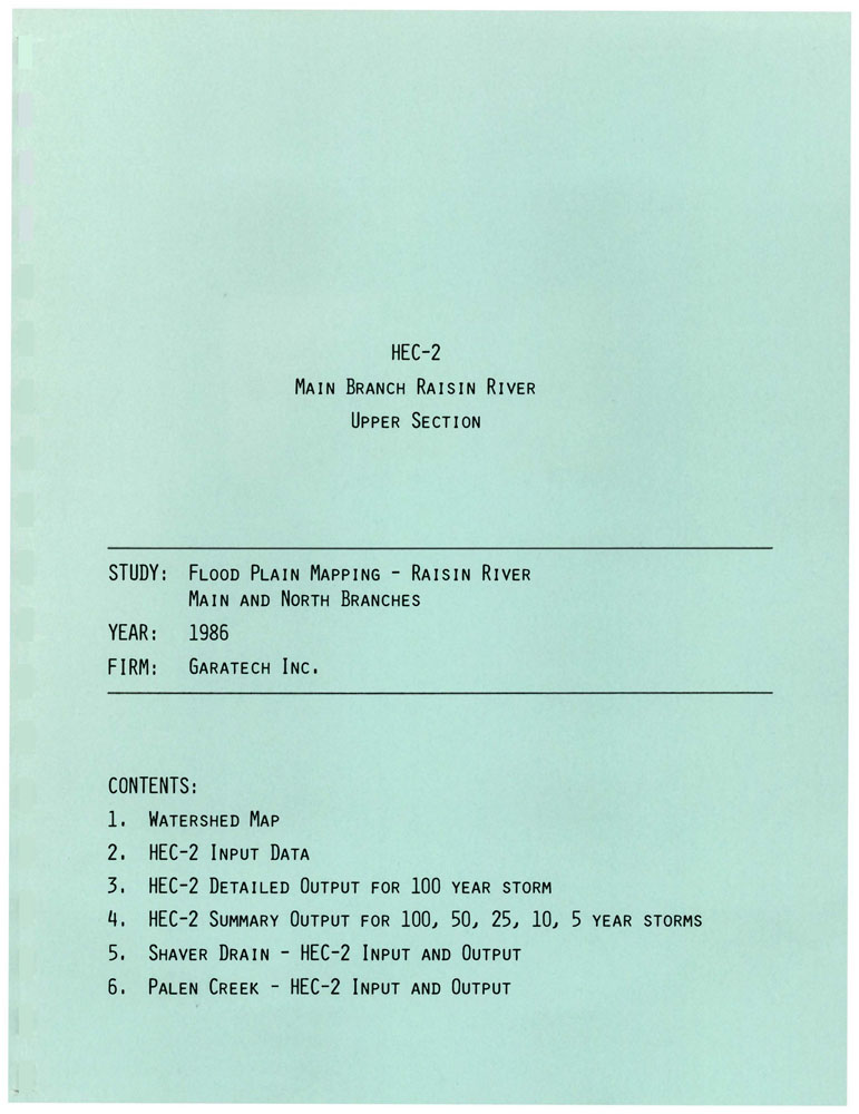 | 0013 | HEC-2Main Branch Raisin River, Upper Section (Model Output), Flood Plain Mapping - Raisin River, Main and North Branches | Garatech Inc | 1986 | Cerlox |
