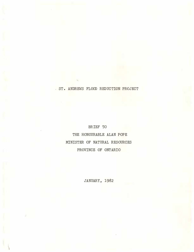 | 0015 | St. Andrews Flood Reduction ProjectBrief to the Honourable Alan Pope Minister of Natural Resources Province of Ontario | 1982 | Cerlox | |