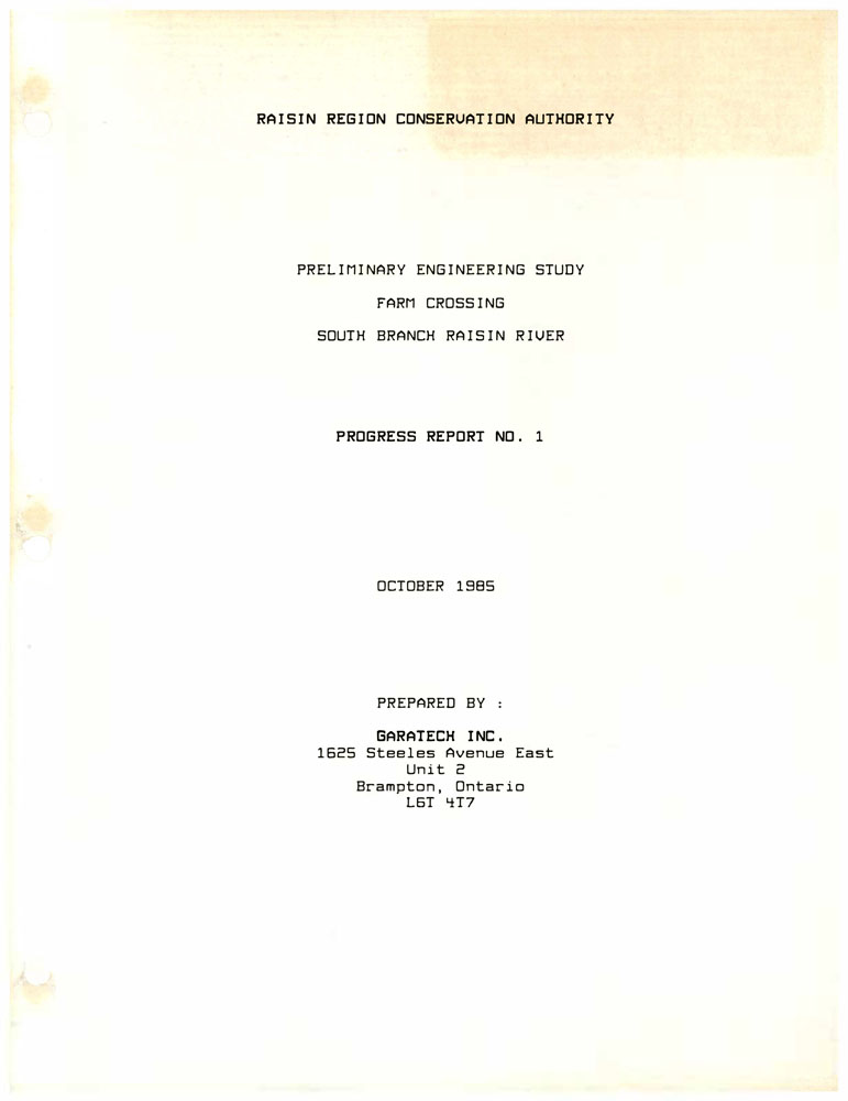 | 0016 | Preliminary Engineering StudyFarm Crossing, South Branch Raisin River, Progress Report No. 1 | Garatech Inc | 1985 | Duotang |