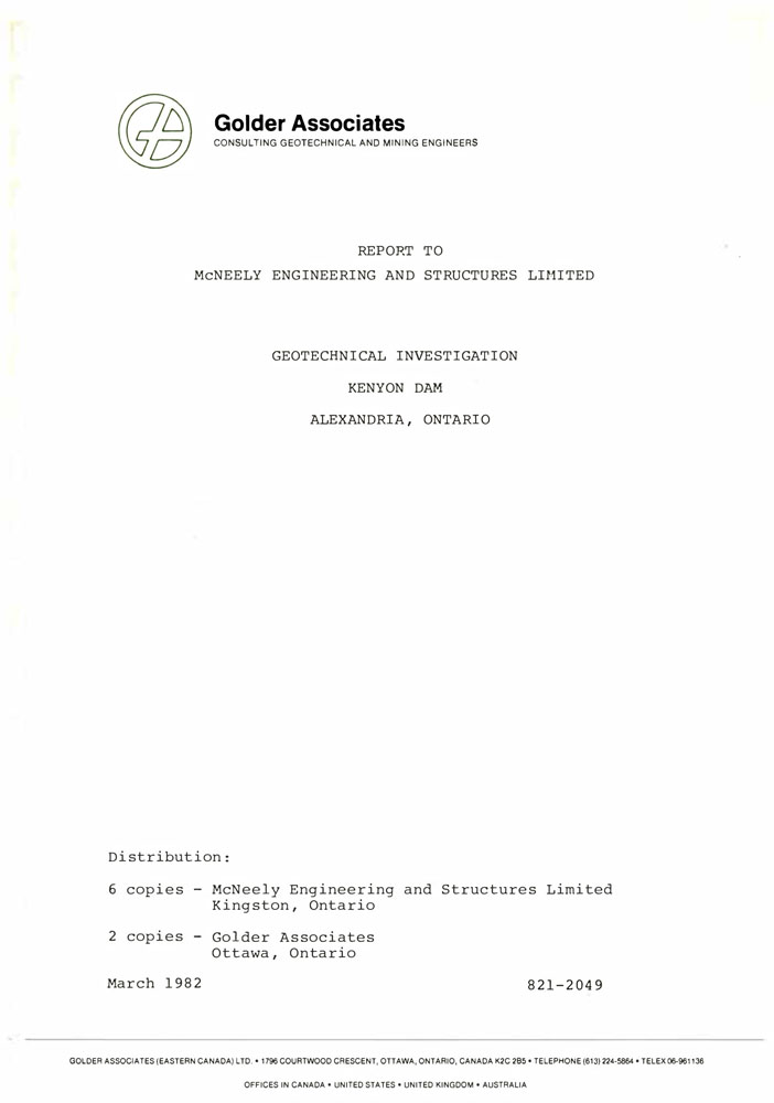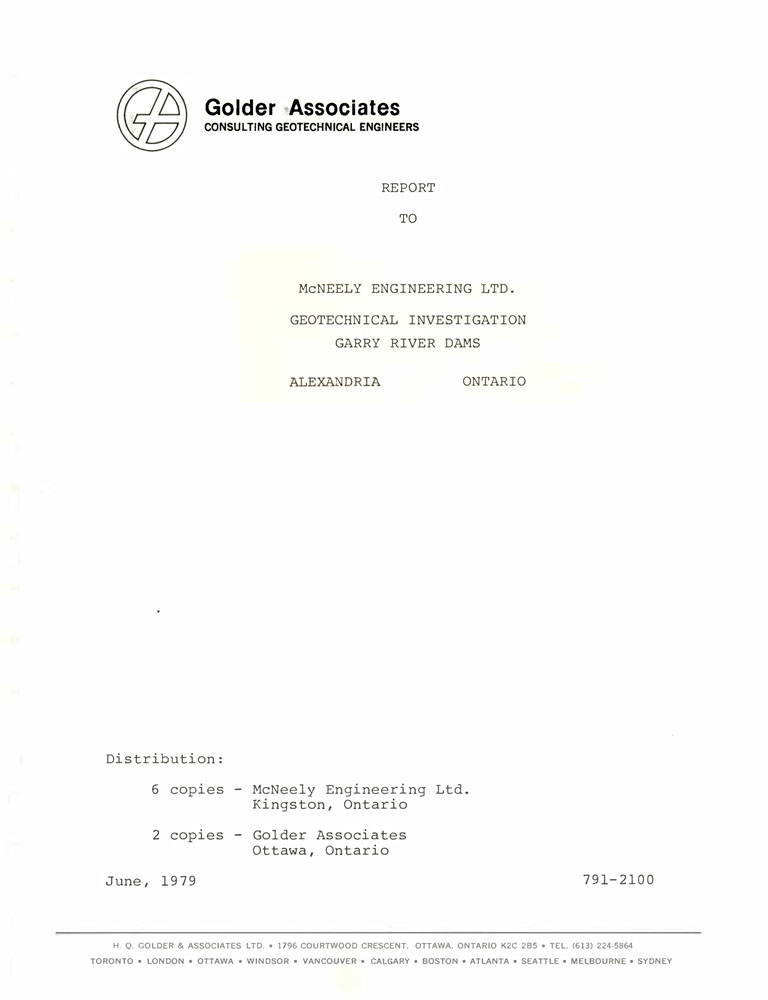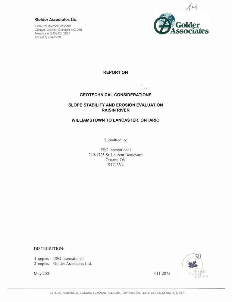 | 0018 | Report on Geotechnical ConsiderationsSlope Stability and Erosion Evaluation Raisin River, Williamstown to Lancaster Ontario | Golder Associates | 2001 | Cerlox |