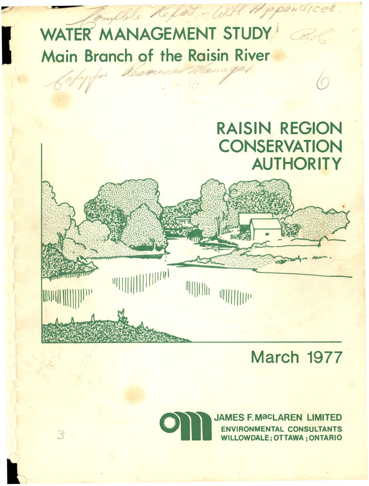| 0019 | Water Management StudyMain Branch of the Raisin River | James F. MacLaren Limited | 1977 | Cerlox. Attachments: 4 maps |