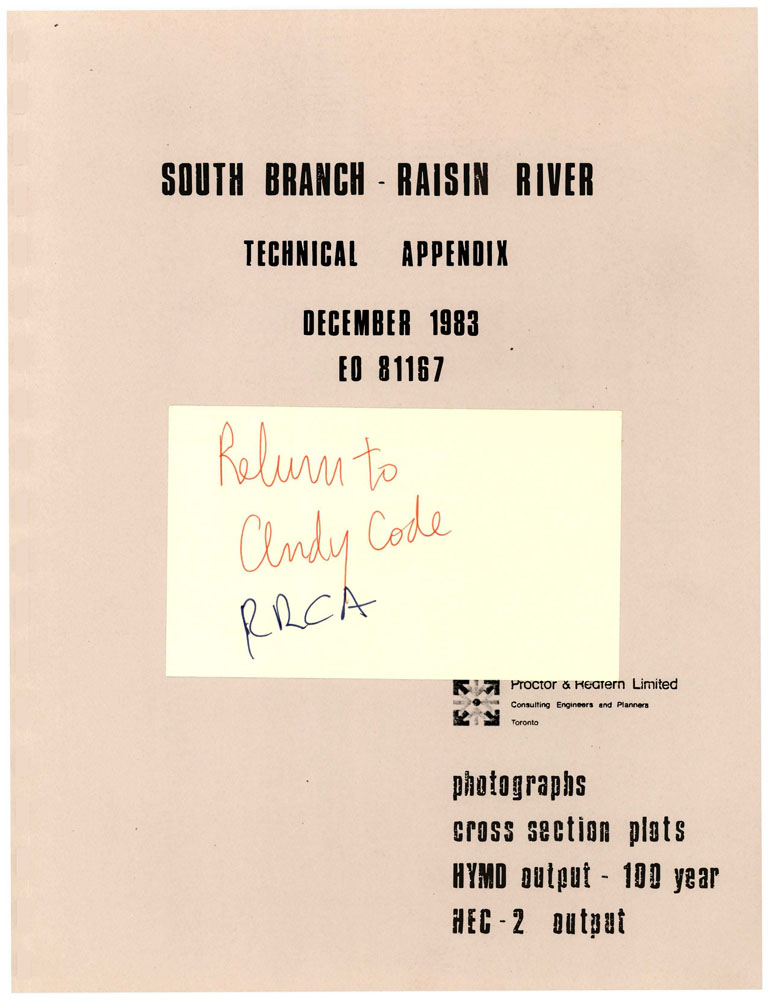 | 0021 | South Branch - Raisin RiverTechnical Appendix | Proctor and Redfern Limited | 1983 | Cerlox |