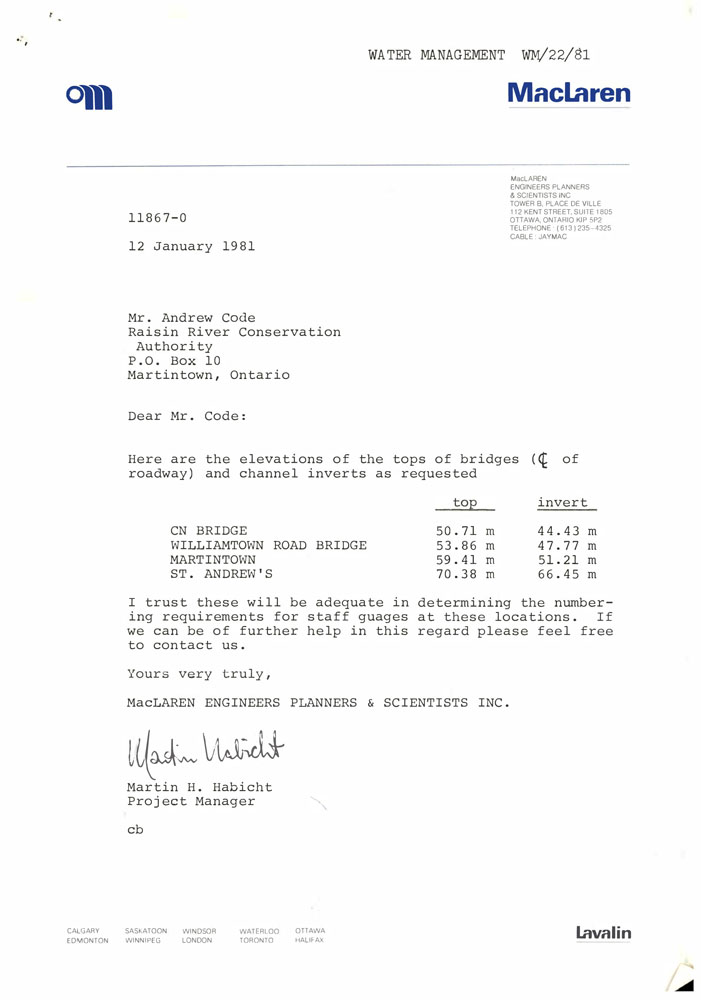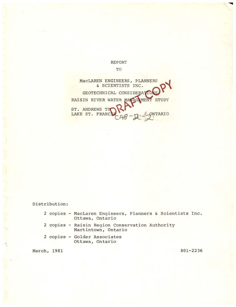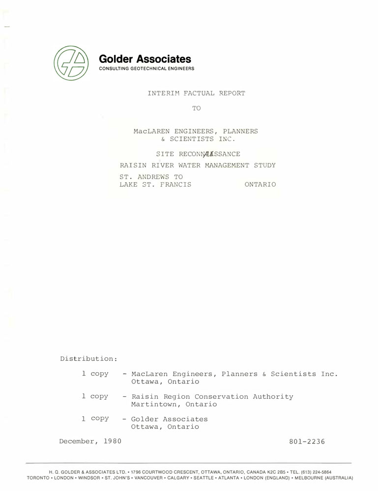 | 0028 | Interim Fatcual Report to MacLaren Engineers, Planners & Scientists Inc.Site Reconnasissance, Raisin River Water Management Study, St. Andrews to Lake St. Francis Ontario | Golder Associates | 1980 | Cerlox. Attachments: 1 map |