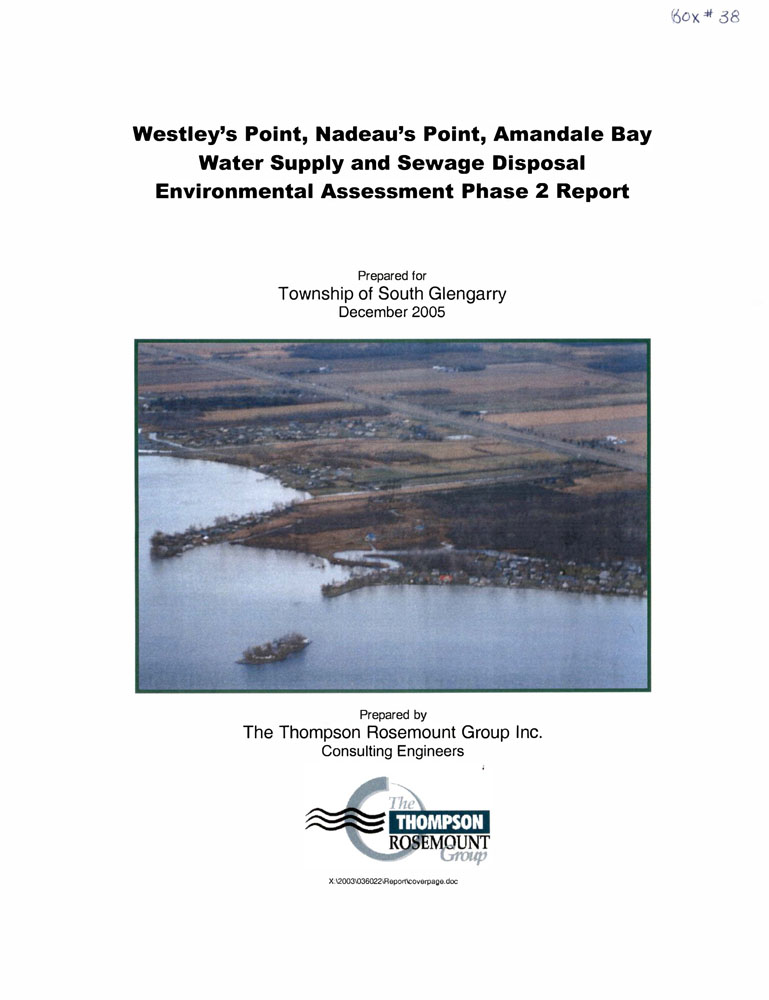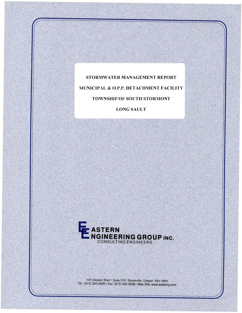 | 0032 | Stormwater Management ReportMunicipal & O.P.P. Detachment Facility, Township of South Stormont, Long Sault | Eastern Engineering Group Inc | 2009 | Cerlox. Attachments: 3 maps |