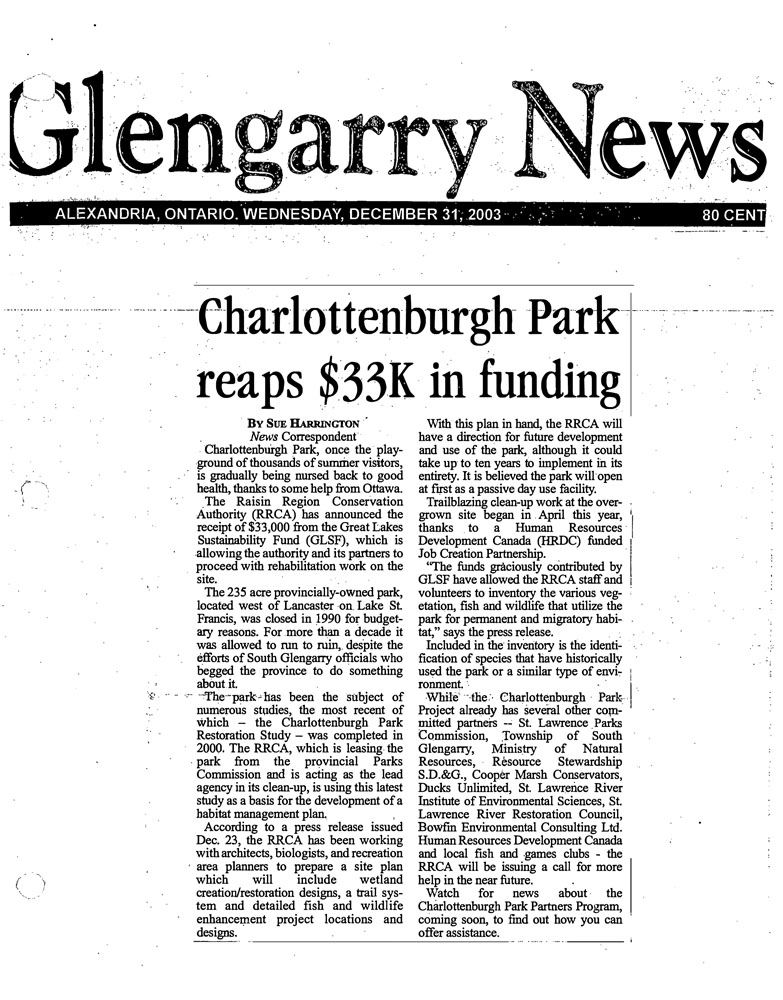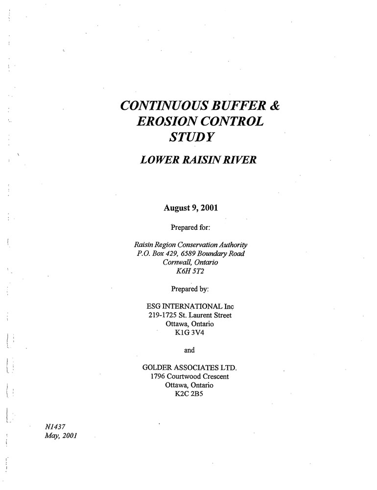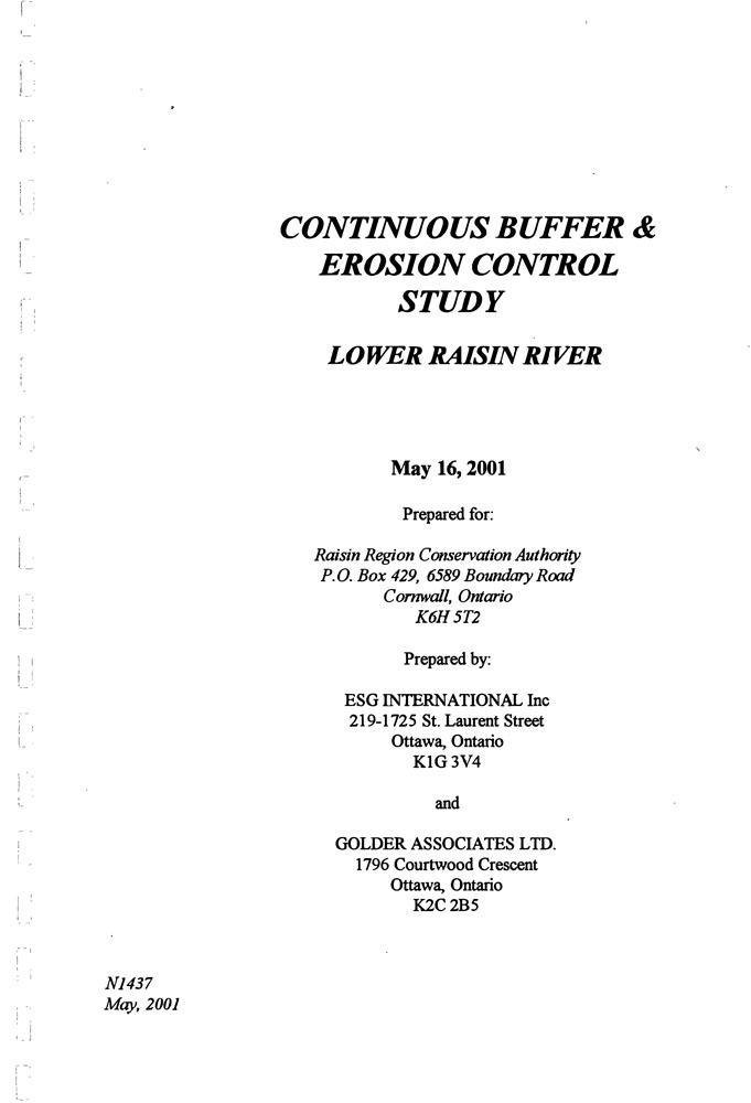 | 0033 | Continuous Buffer and Erosion Control StudyLower Raisin River | EGS International Inc., Golder Associated Ltd | 2001 | Cerlox. Attachments: 5 maps |