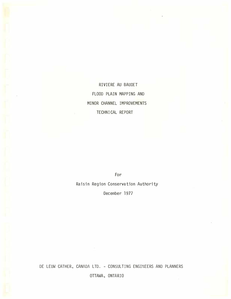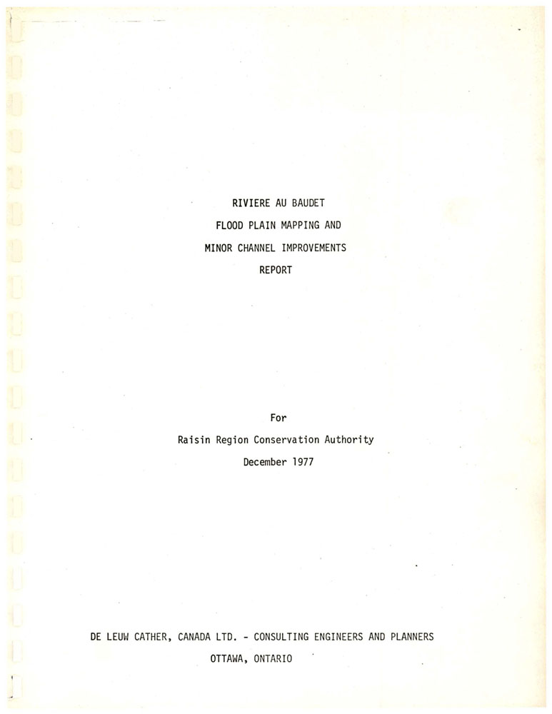 | 0035 | Riviere BeaudetFlood Plain Mapping and Minor Channel Improvements, Technical Report | De Leuw Cather, Canada Ltd | 1977 | Cerlox. Attachments: 12 maps |