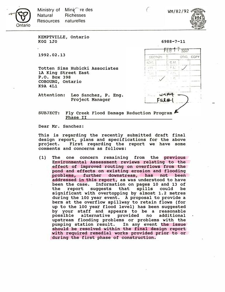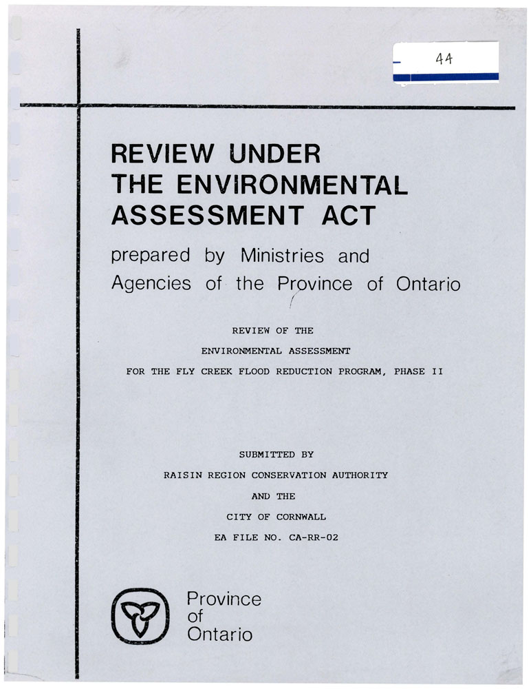 | 0044 | Review of the Environmental AssessmentFor the Fly Creek Flood Reduction Program, Phase 2 | RRCA, City of Cornwall | 1989 | Cerlox |