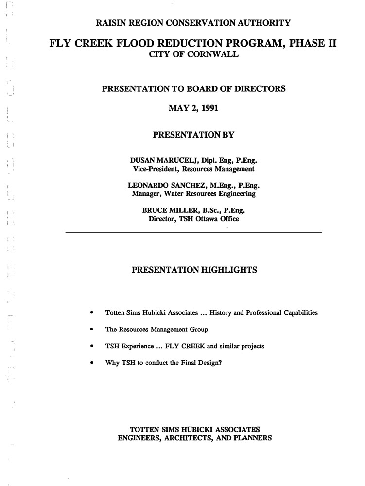 | 0056 | Fly Creek Flood Reduction ProgramPhase 2, City of Cornwall, Presentation to Board of Directors | Totten Sims Hubicki Associates, Presented by: Dusan Marucelj, Leonardo Sanchez, Bruce Miller | 1991 | Cerlox |