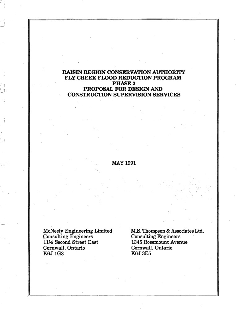 | 0059 | Fly Creek Flood Reduction ProgramPhase 2, Proposal for Design and Construction Supervision Services | McNeely Engineering Limited, M.S. Thompson and Associates Ltd. | 1991 | Cerlox |