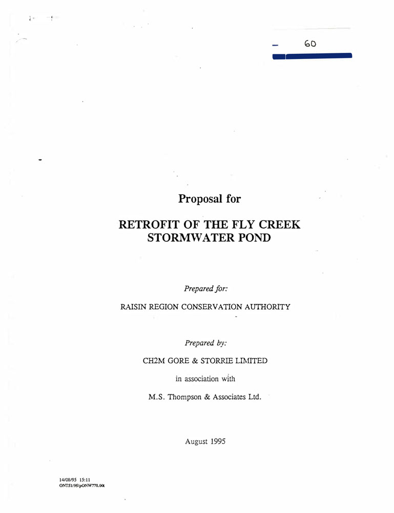 | 0060 | Proposal for Retrofit of the Fly Creek Stormwater PondPrepared for: RRCA | CH2M Gore and Storrie Limited, M.S. Thompson and Associates Ltd. | 1995 | Cerlox |