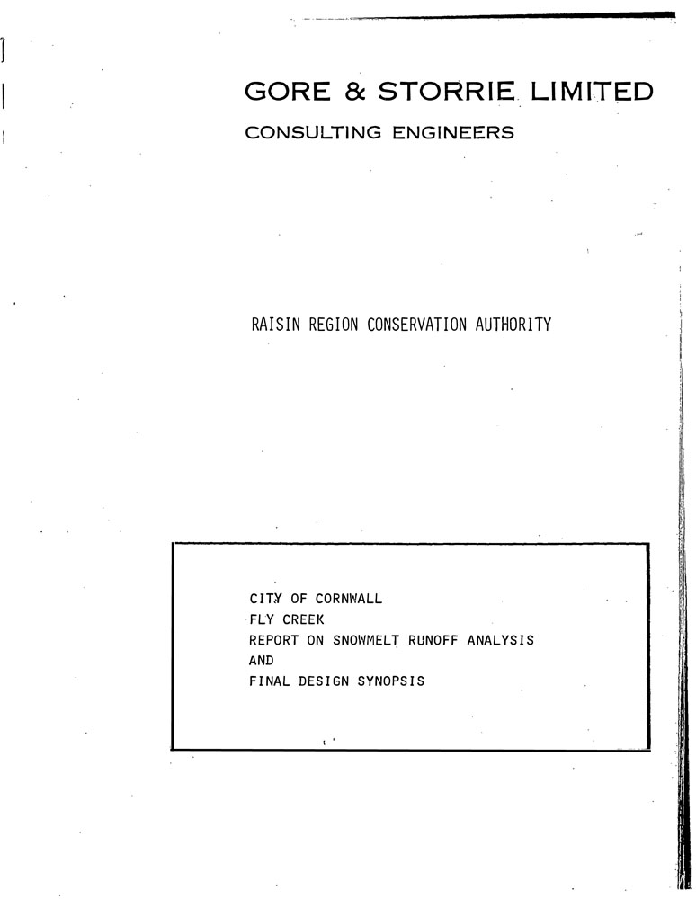 | 0076 | City of CornwallReport on Fly Creek, Phase 2, Draft | Gore and Storrie Limited | 1977 | Cerlox. Attachments: 3 maps |