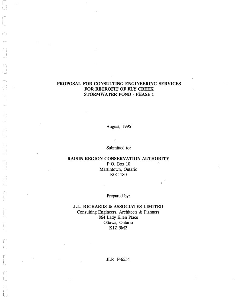 | 0068 | Proposal for Consulting Engineering ServicesFor Retrofit of Fly Creek, Stormwater Pond, Phase 1 | J.L. Richards and Associates Limited | 1995 | Cerlox |
