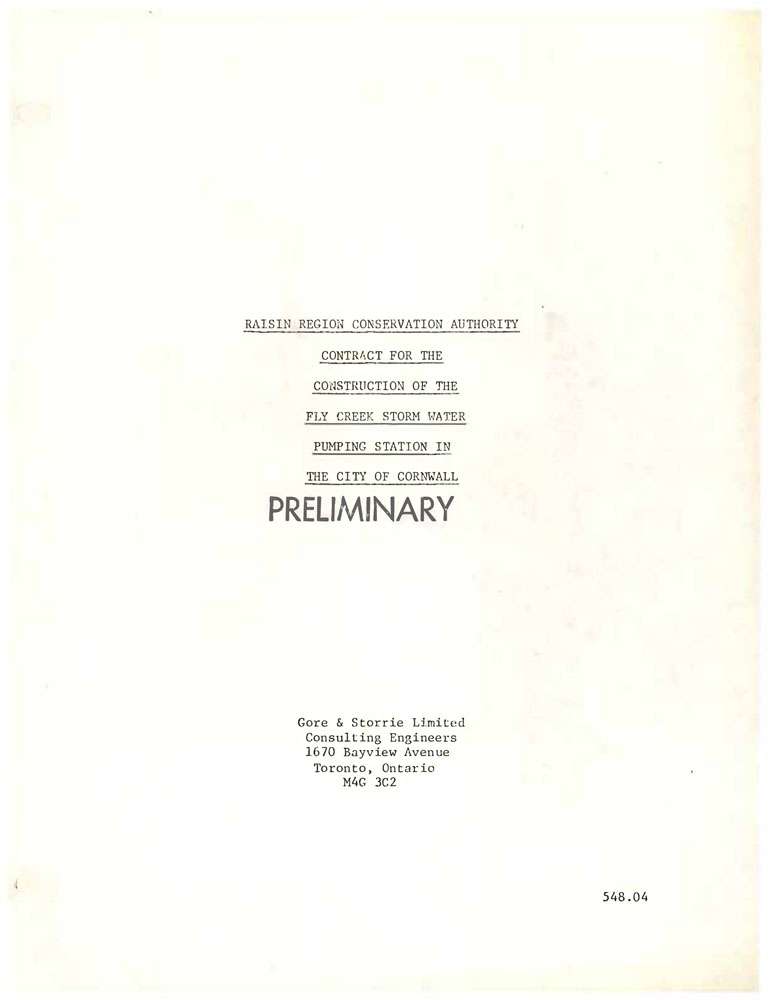 | 0071 | Contract for the Construction of the Fly Creek Storm Water Pumping StationIn the City of Cornwall, Preliminary | Gore and Storrie Limited | 1960 | Metal binding throught hole punches |