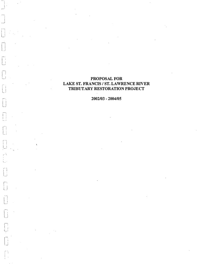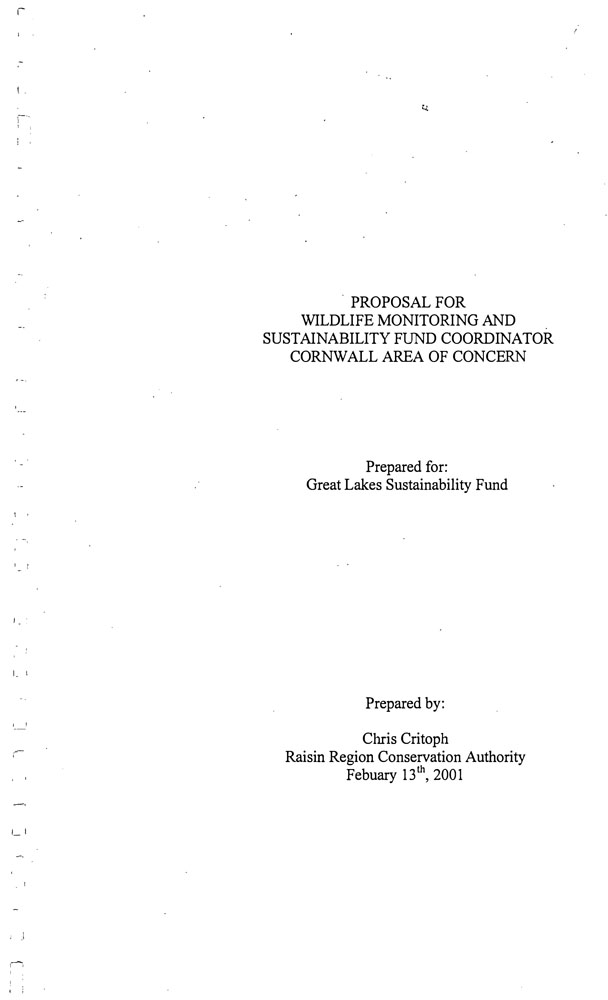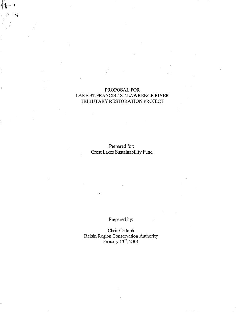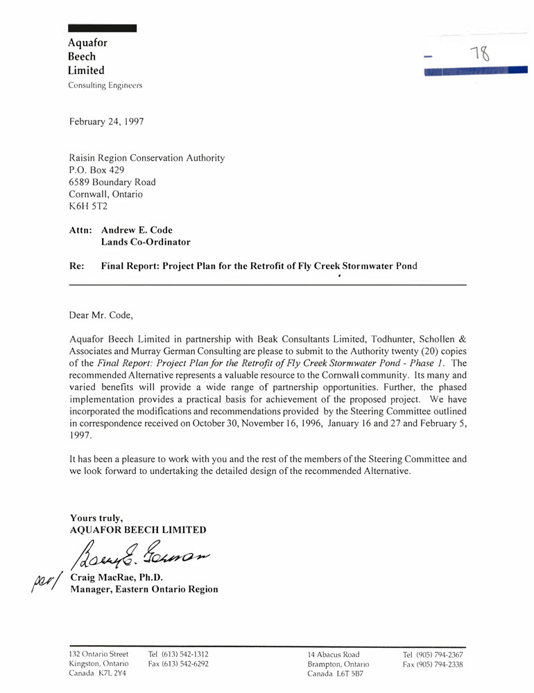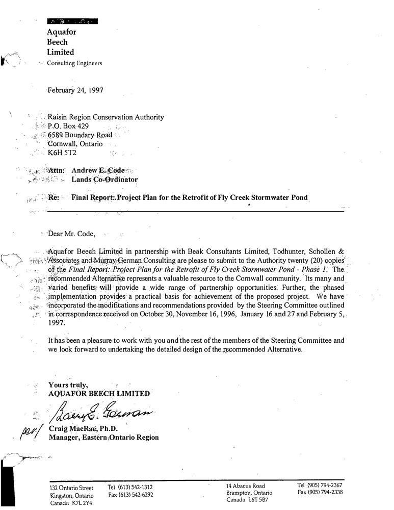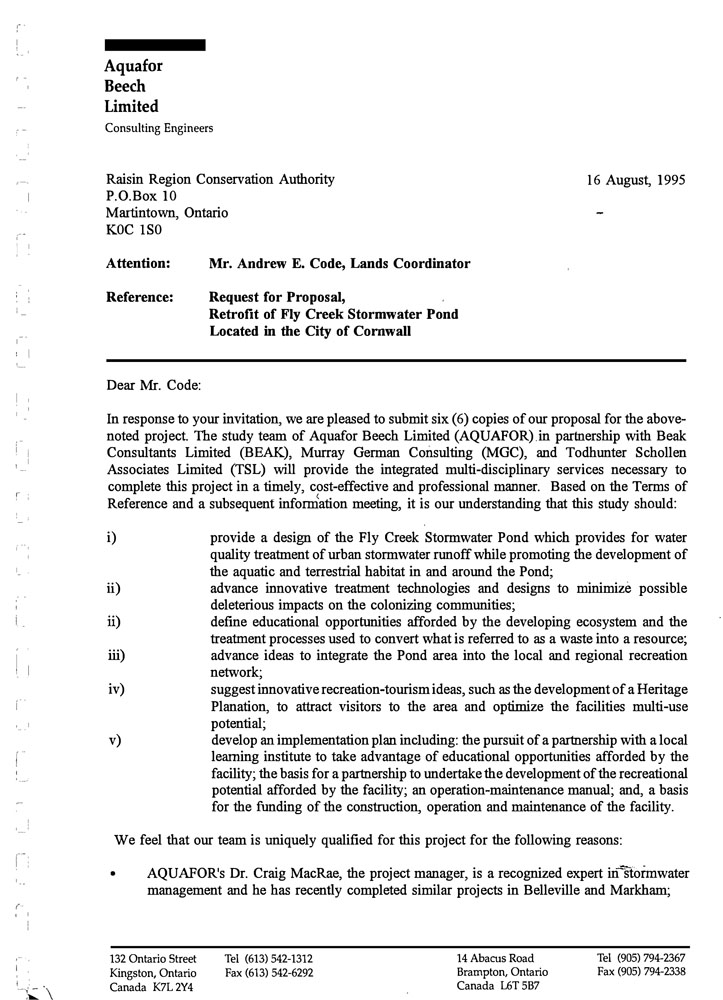 | 0072 | Proposal to Provide Consulting Services for theRetrofit for Fly Creek Stormwater Pond, Phase 1, For the RRCA in conjunction with the City of Cornwall, The St. Lawrence RAP TEAM and PAC | Aquafor Beech Limited in association with, Beak Consultants Limited, Todd-Hunter Schollen Limited, Murray German Consulting | 1995 | Cerlox |