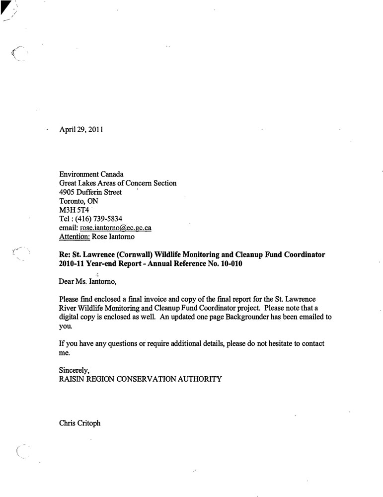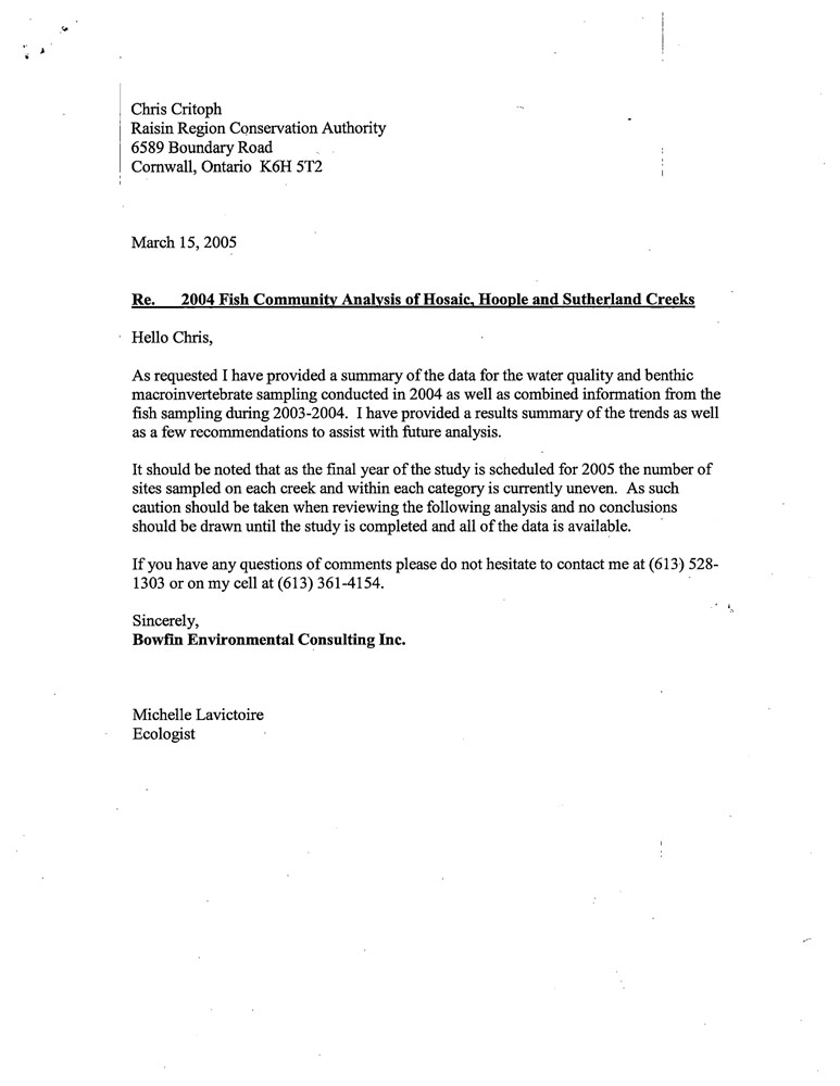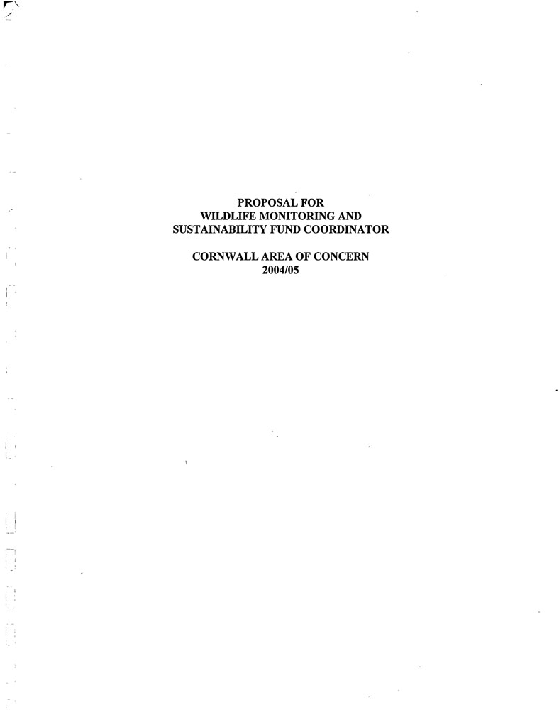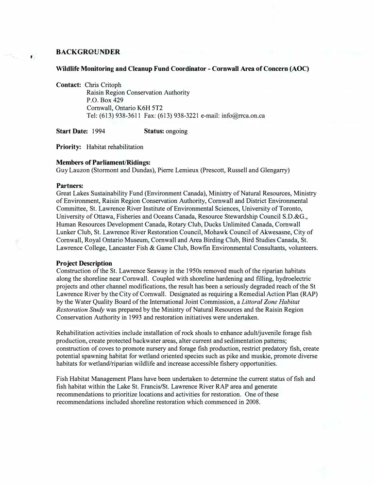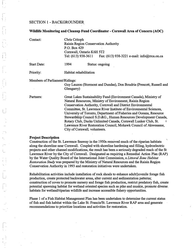 | 0072 | Proposal to Provide Consulting Services for theRetrofit for Fly Creek Stormwater Pond, Phase 1, For the RRCA in conjunction with the City of Cornwall, The St. Lawrence RAP TEAM and PAC | Aquafor Beech Limited in association with, Beak Consultants Limited, Todd-Hunter Schollen Limited, Murray German Consulting | 1995 | Cerlox |