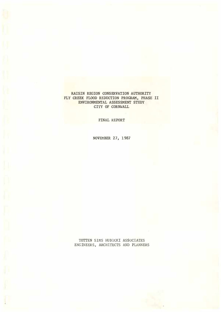 | 0074 | Fly Creek Flood Reduction ProgramPhase 2, Environmental Assessment Study, City of Cornwall, Final Report | Totten Sims Hubicki Associates | 1987 | Cerlox. Attachments: 2 maps |
