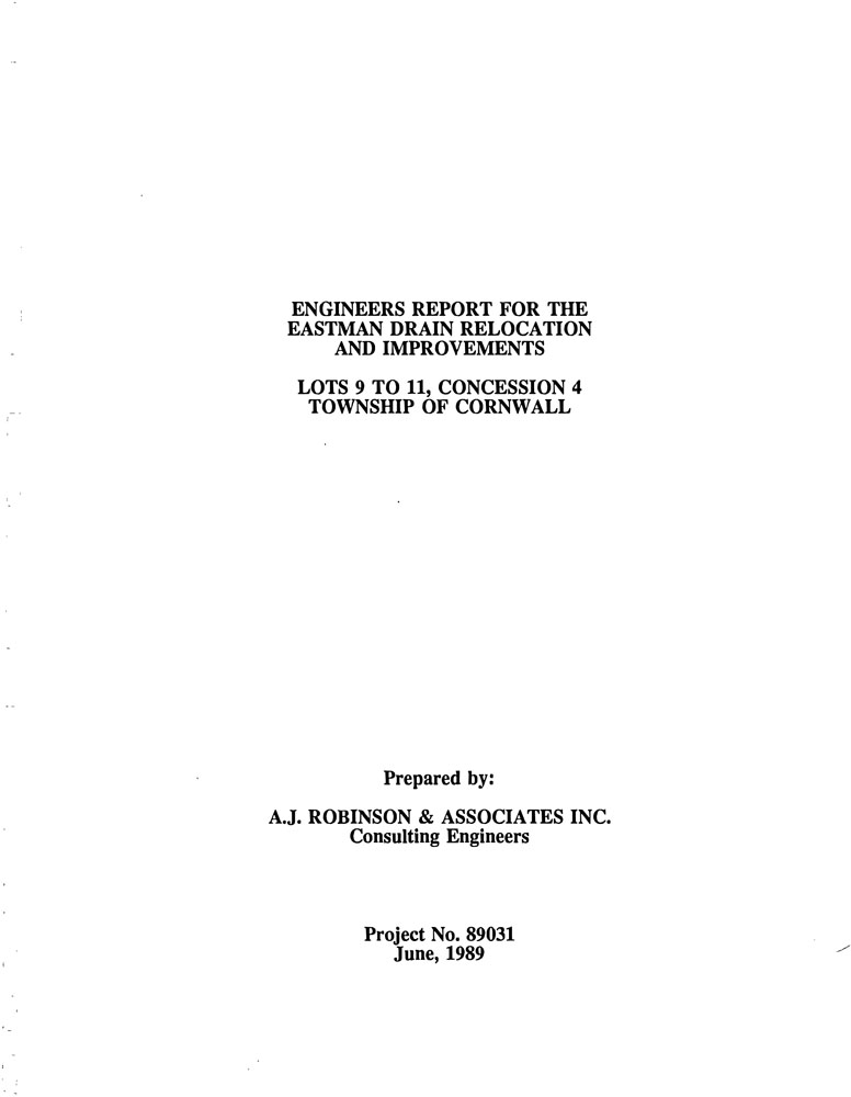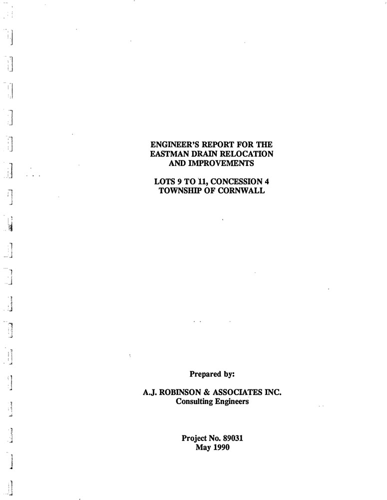 | 0080 | Engineer's Report for the Eastman Drain Relocation and ImprovementsLots 9 to 11, Concession 4, Township of Cornwall | A.J. Robinson and Associates Inc | 1989 | Cerlox. Attachments: 4 maps |