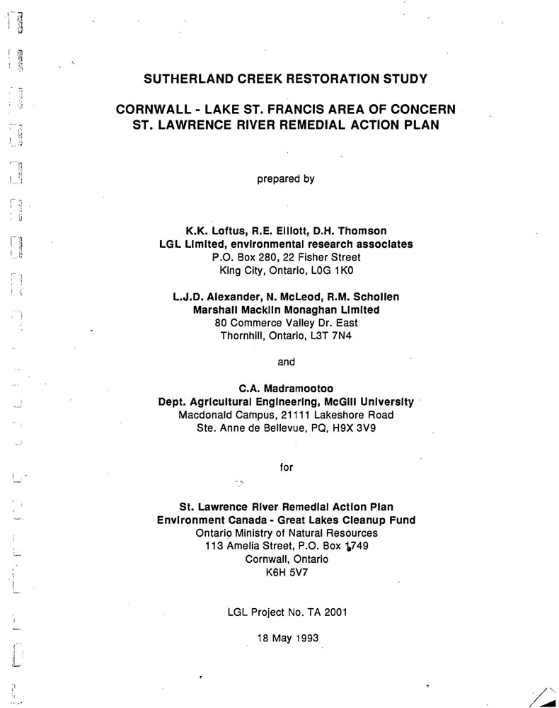 | 0084 | Sutherland Creek Restoration StudyCornwall - Lake St. Francis Area of Concern, St. Lawrence River Remedial Action Plan | K.K. Loftus, R.E. Elliott, D.H Thomson LGL Limited, L.J.D. Alexander, N. McLeod, R.M. Schollen Marshall Macklin Monaghan Limited, C.A. Madramootoo Dept. Agricultural Engineering, McGill University, St. Lawrence River Remedial Action Plan Environment Canada - Great Lakes Cleanup Fund | 1993 | Cerlox |