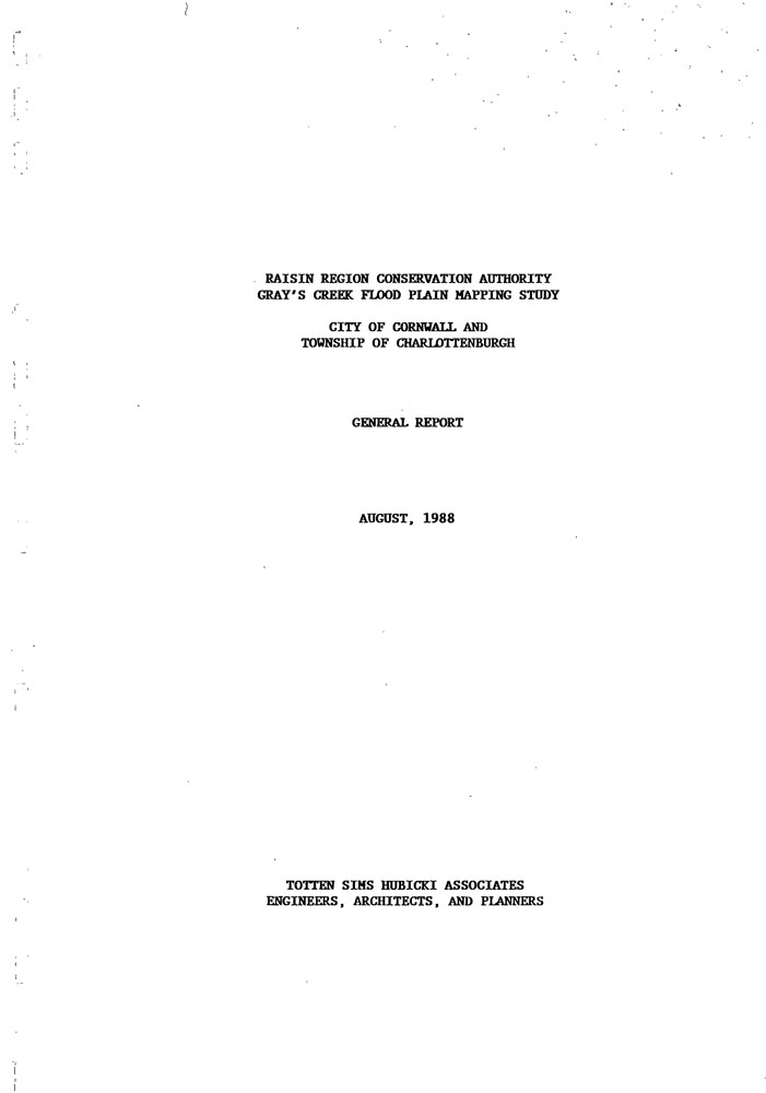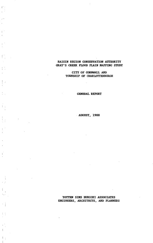 | 0091 | Gray's CreekFlood Plain Mapping Study, City of Cornwall and Township of Charlottenburgh | Totten Sims Hubicki Associates | 1988 | Cerlox |