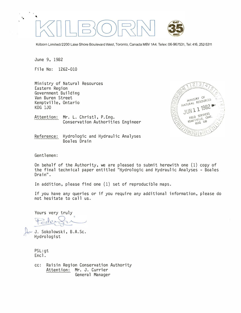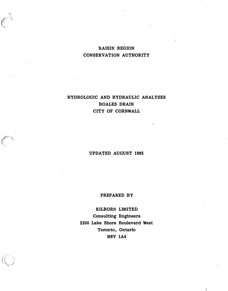 | 0093 | Hydrologic and Hydraulic AnalysesBoales Drain, City of Cornwall, Final Report | Kilborn Limited | 1982 | Folder |