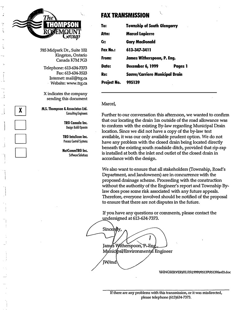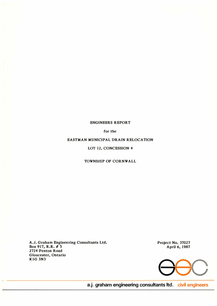 | 0094 | Engineers Report for the Eastman Municipal Drain RelocationLot 12, Concession 4, Township of Cornwall | A.J. Graham Engineering Consultants Ltd | 1987 | Cerlox. Attachments: 1 map |