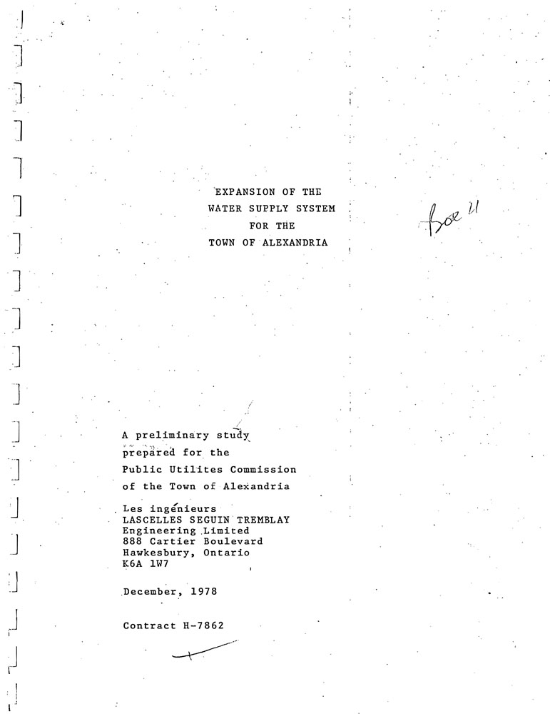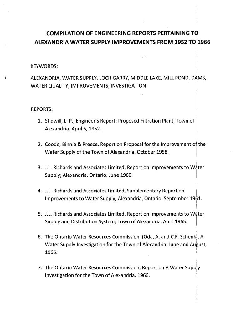 | 0350 | Compilation of Engineering Reports Pertaining to Alexandria Water Supply Improvements from 1952 to 1966Keywords: Alexandria, water supply, Loch Garry, Middle Lake, Mill Pond, dams, water quality, improvements, investigation, Cardinal Bridge, Kenyon Dam, dredge | Stidwill, J.L. Richards, Coode, Ontario Water Resources Commission | 1952 | Cerlox |
