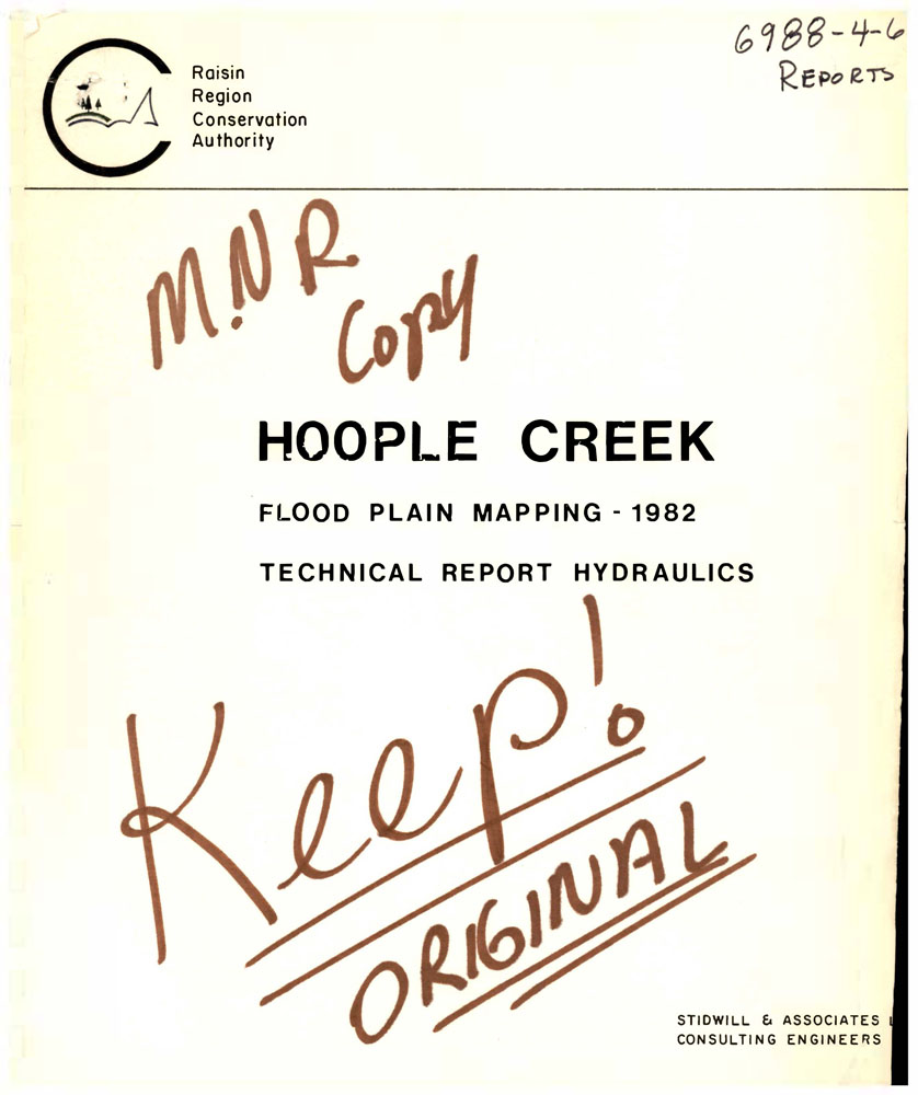 | 0089 | South BranchRaisin River, Flood and Fill Line Mapping, RRCA, Final Report | The Proctor and Redfern Group | 1984 | Cerlox |