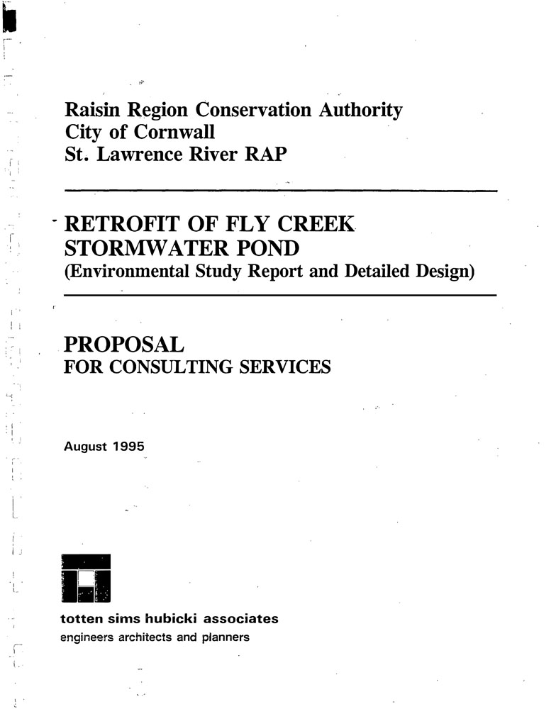 | 0054 | Retrofit of Fly CreekStormwater Pond, (Environmental Study Report and Detailed Design), Proposal for Consulting Services | Totten Sims Hubicki Associates | 1995 | Cerlox |