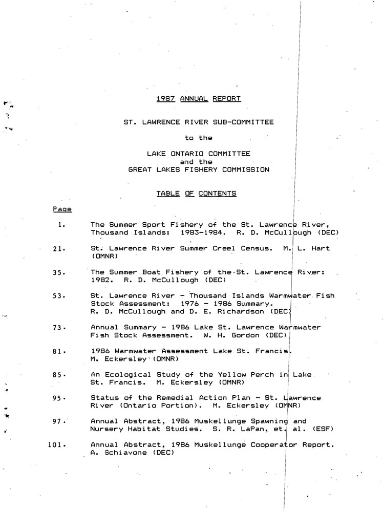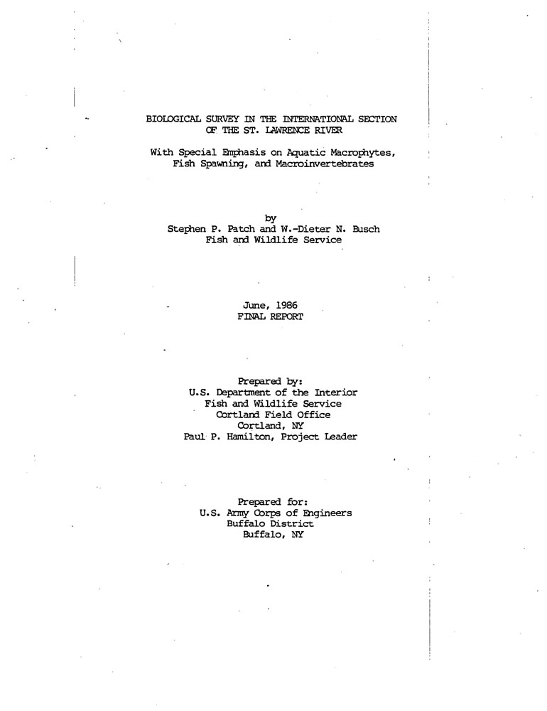 | 0338 | A Biological Survey in the International Section of the St. Lawrence RiverWith Special Emphasis on Aquatic Macrophytes, Fish Spawning, and Macroinvertebrates, Volume ll: Appendix D, Final Report | U.S Department of the Interior Fish and Wildlife Service, Cortland Wildlife Office | 1986 | Cerlox |