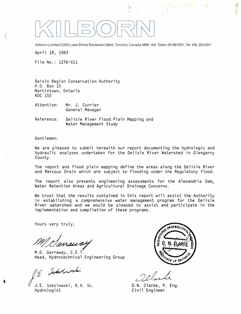 | 0002 | Floodplain Mapping and Water Management Study Delisle River | Kilborn Limited | 1983 | Binder |