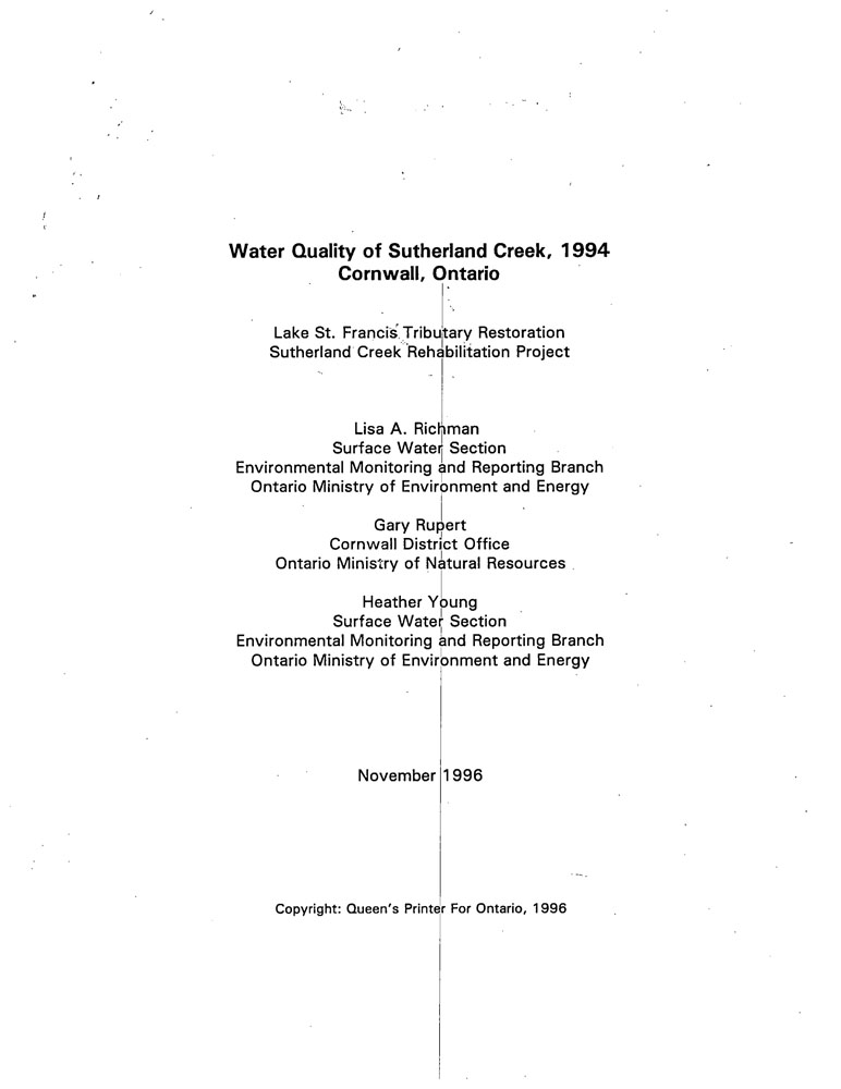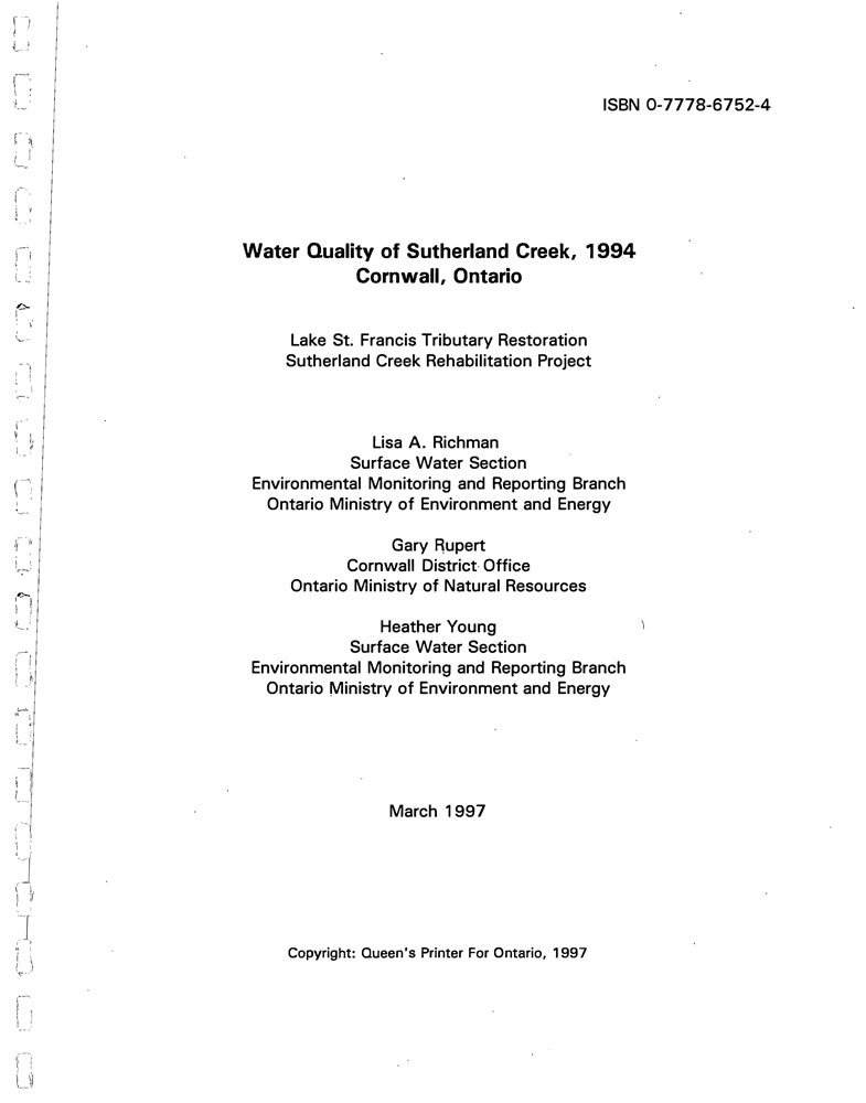 | 0306 | Water Quality of Sutherland Creek, 1994, Cornwall, OntarioLake St.Francis Tributary Restoration Sutherland Creek Rehabilitation Project | Lisa A. Richman, Gary Rupert , Heather Young | 1996 | Paperclip |