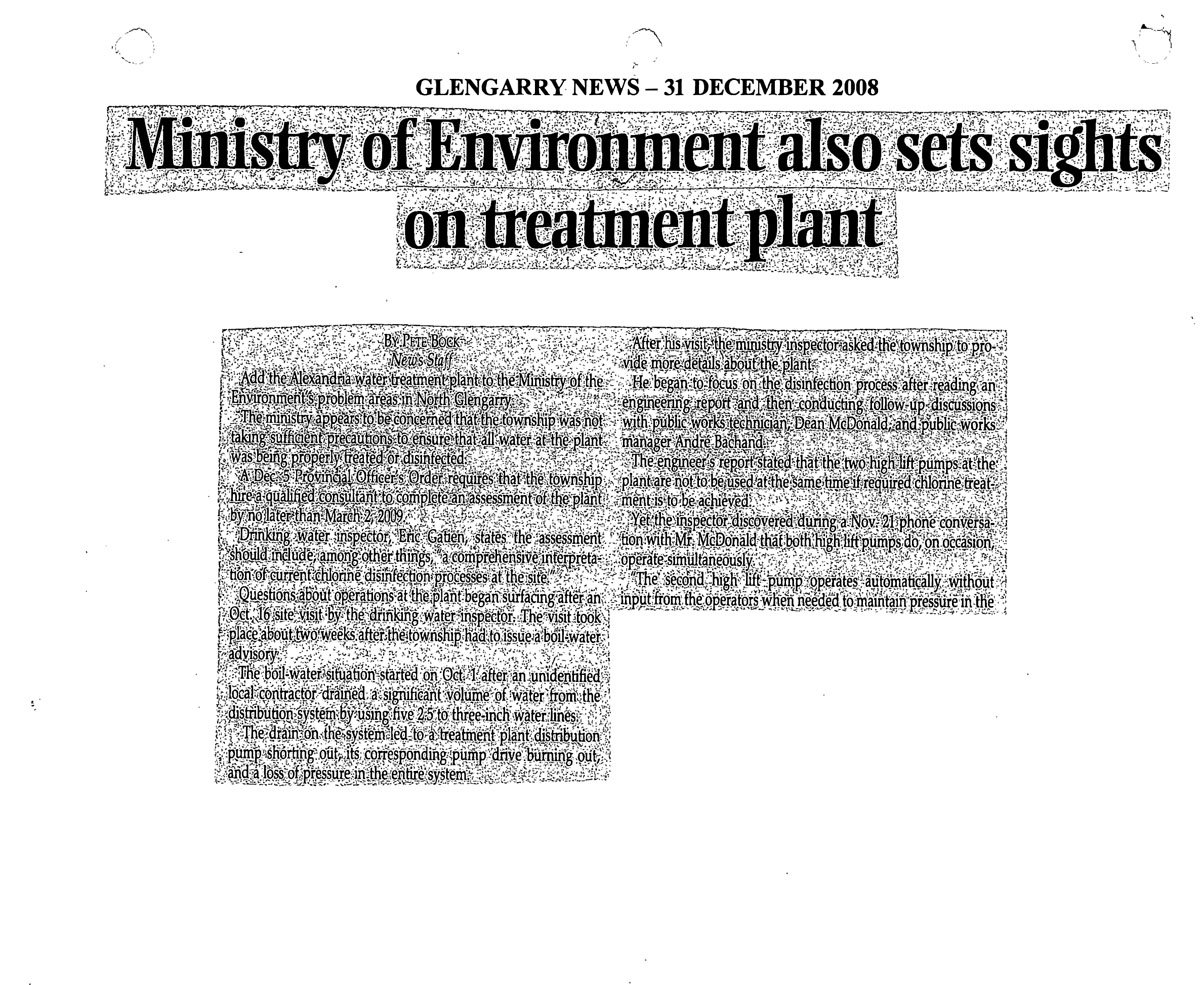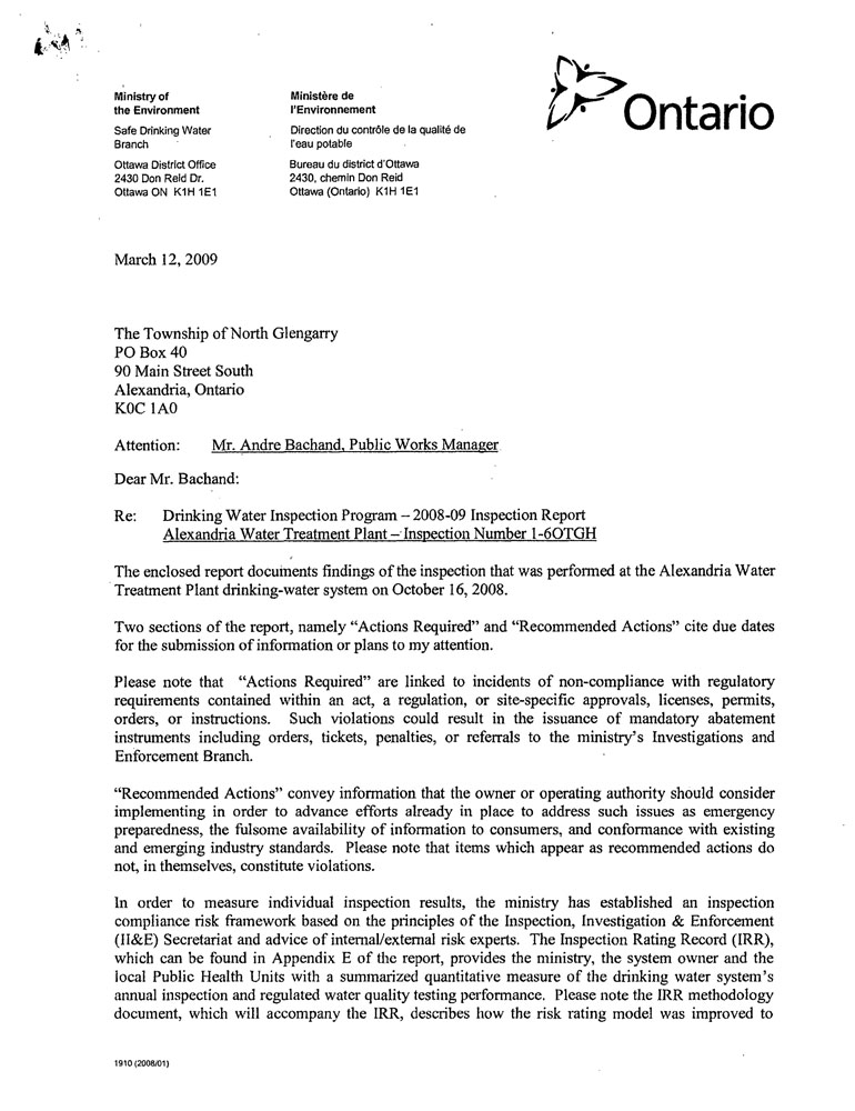 | 0300 | Alexandria Water Treatment PlantDrinking Water System Inspection Report | Eric Gatien, Ministry of the Environment | 2008 | Paper clip |