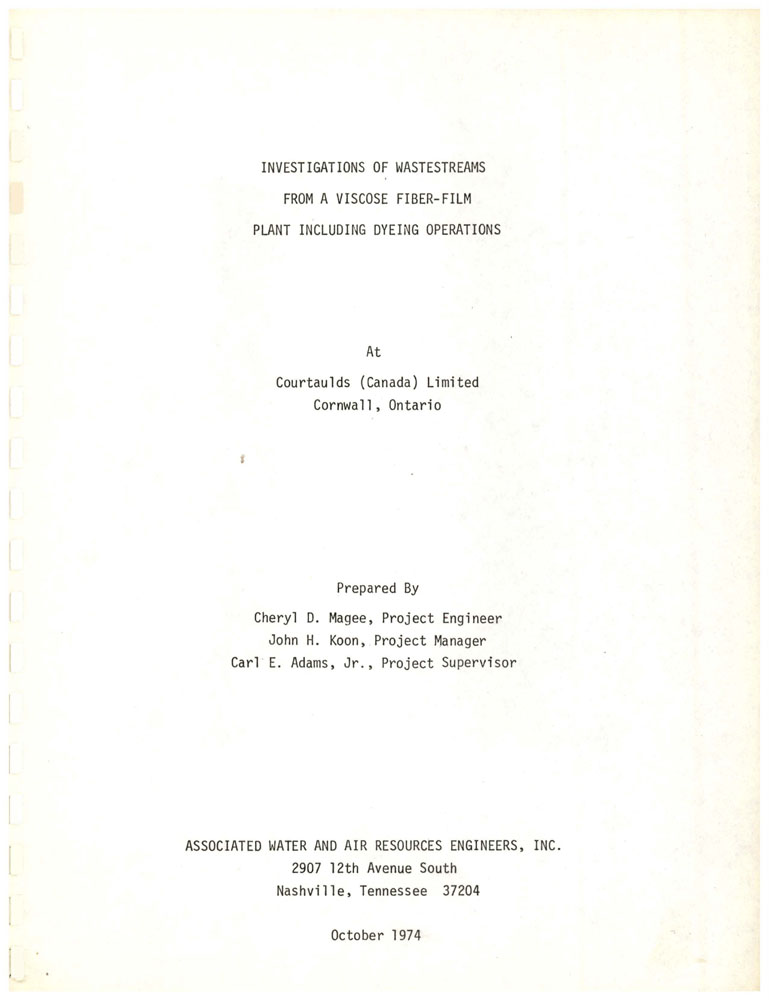 | 0257 | Investigations of Wastestreams from a Viscose Fiber-Film Plant Including Dyeing OperationsAt Courtaulds (Canada) Limited | Cheryl D. Magnee, John H. Koon, Carl E. Adams, Jr | 1974 | Cerlox |