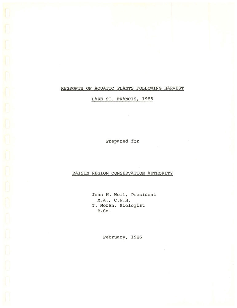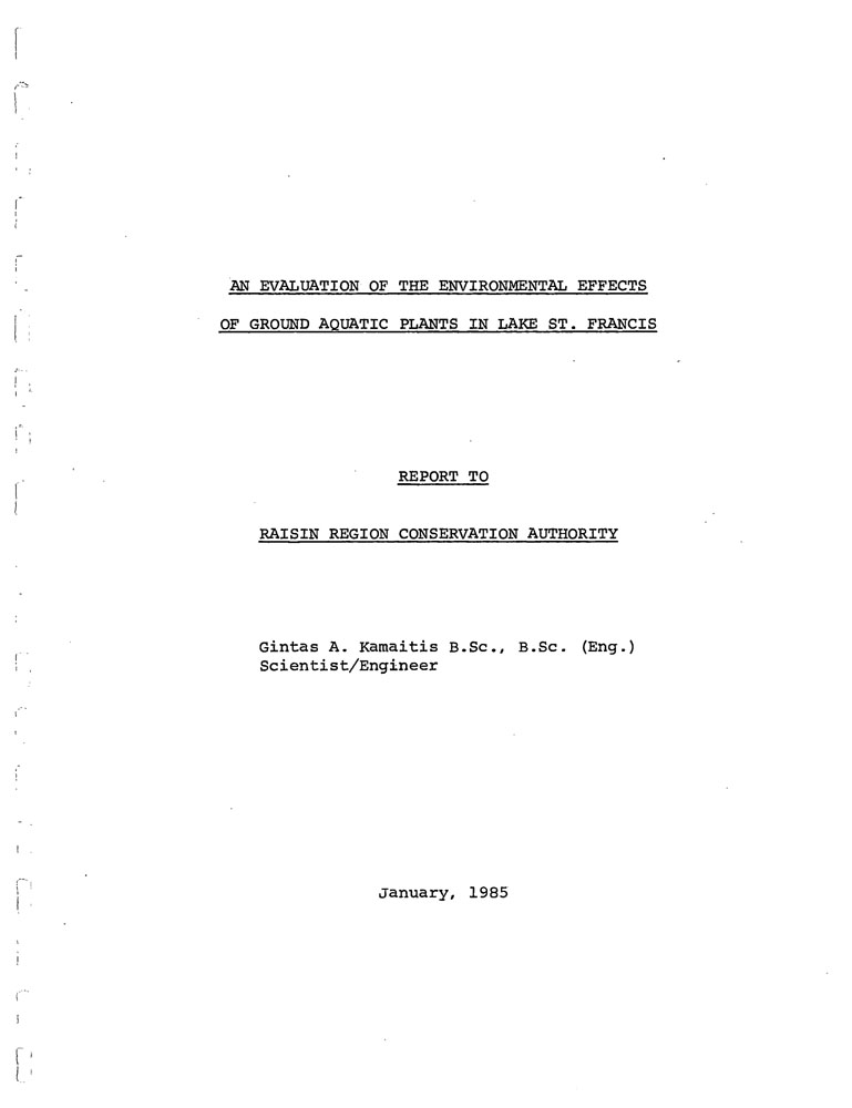 | 0263 | An Evaluation of the Environmental Effects of Ground Aquatic Plants in Lake St. FrancisReport to Raisin Region Conservation Authority | Limnos Ltd | 1985 | Cerlox. Attachments: 1 Map |