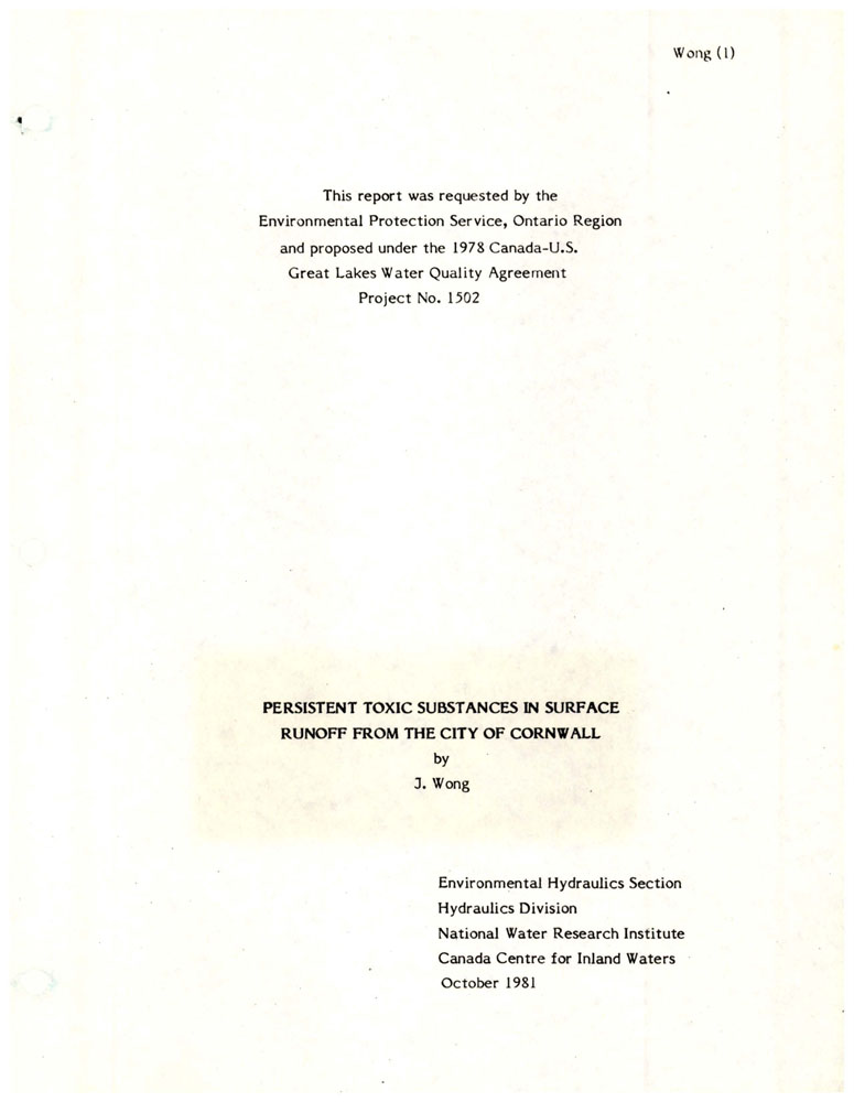 | 0259 | National Water Research InstitutePersistent Toxic Substances in Surface Runoff From the City of Cornwall | J. Wong | 1981 | Duotang |