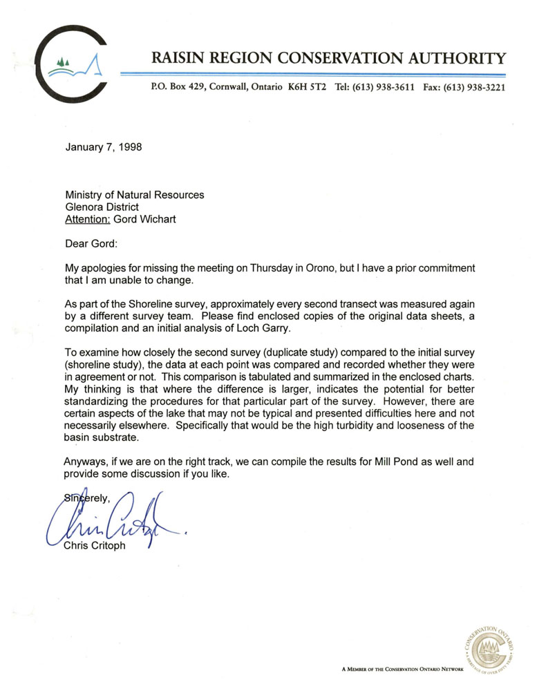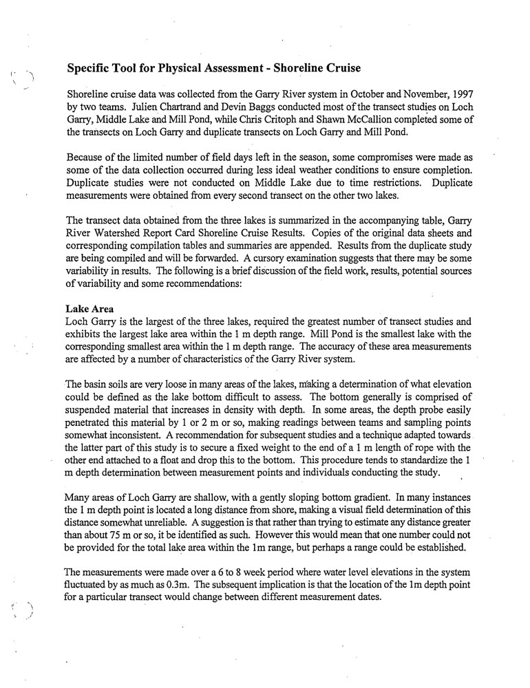 | 0261 | Shoreline StudyLoch Garry | Raisin Region Conservation Authority | 1998 | Duotang. Attachments: Sediment Analysis - Loch Garry |