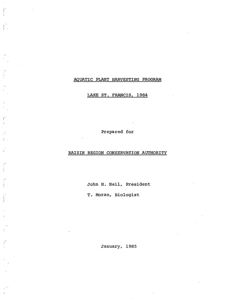 | 0265 | Aquatic Harvesting ProgramLake St. Francis 1984, Appendices, Maps, and Attachments | Limnos Ltd | 1985 | Cerlox. Attachments: 2 Maps |