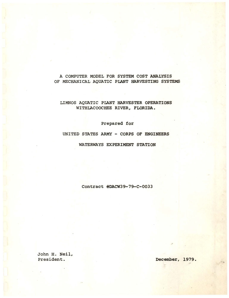 | 0266 | A Computer Model for System Cost Analysis of Mechanical Aquatic Plant Harvesting SystemsLimnos Aquatic Plant Harvester Operations Withlacoochee River, Florida, Prepared for United States Army - Corps for Engineers, Waterways Experiment Station | John H. Neil, Daniel Leclair | 1979 | Cerlox |