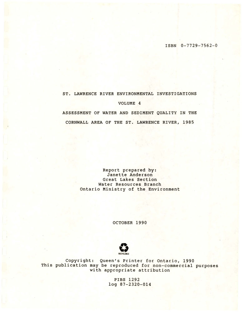| 0268 | St. Lawrence RiverEnvironmental Investigations Volume 4, Assessment of Water and Sediment Quality in the Cornwall Area of the St. Lawrence River 1985 | Jannett Anderson | 1990 | Cerlox |
