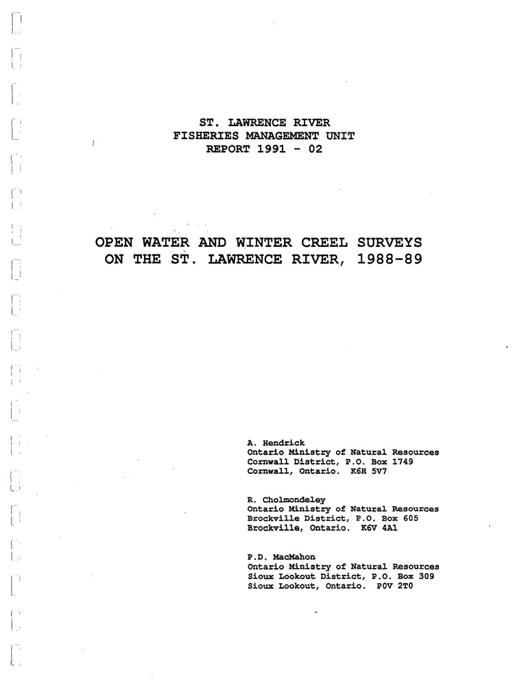 | 0271 | St. Lawrence River Fisheries Management Unit Report 1991-02Open Water and Winter Creel Surveys on the St. Lawrence River, 1988-89 | A. Hendrick, R. Cholmondeley, P. D. MacMahon | 1992 | Cerlox |