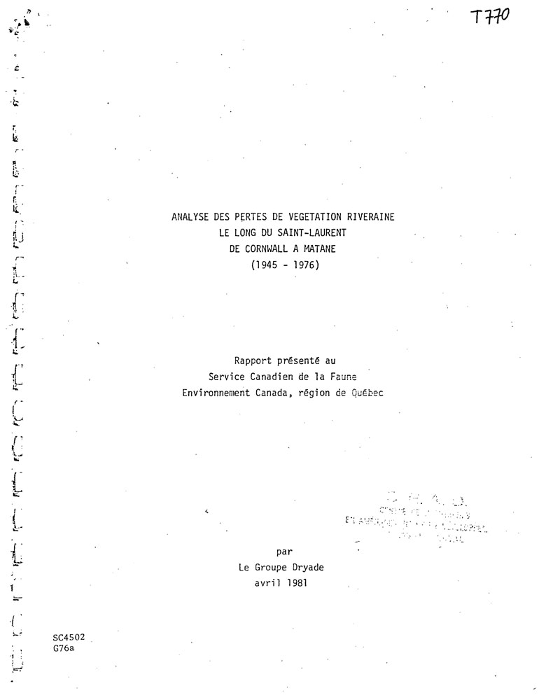 | 0272 | Analyse des Parties de Vegetation RiveraineLe Long du Saint-Laurent de Cornwall a Matane (1945-1976), Rapport Presente au Service Canadien de la Faune, Environnement Canada, Region du Quebec | Le Groupe Dyrade | 1981 | Stapled |