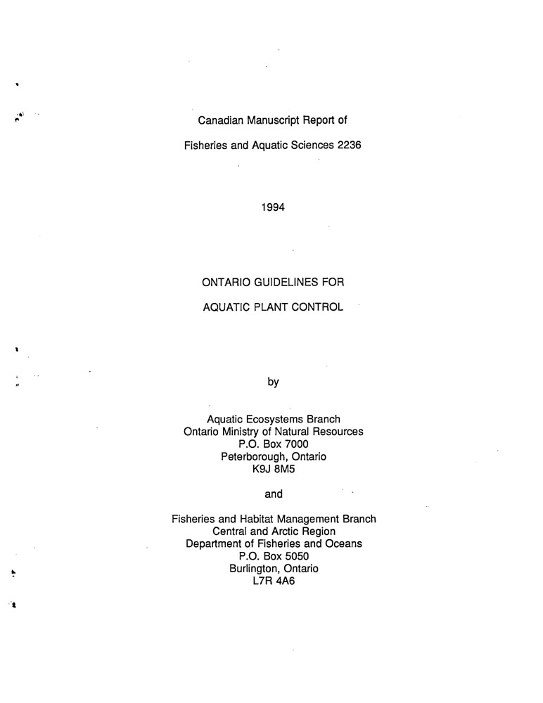 | 0280 | Ontario Guidelines for Aquatic Plant ControlCanadian Manuscrpit Report of Fisheries and Aquatic Sciences | Aquatic Ecosystems Branch, Fisheries and Habitat Management Branch | 1994 | Paperclip |