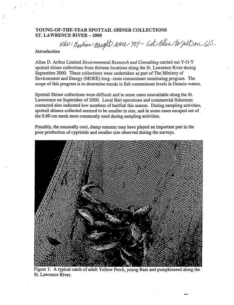 | 0297 | Young-of-the-Year-Spotttail Shiner CollectionsSt. Lawrence River - 2000 | Allan D. Arthur Limited Environmental Research and Consulting | 2001 | Paperclip |