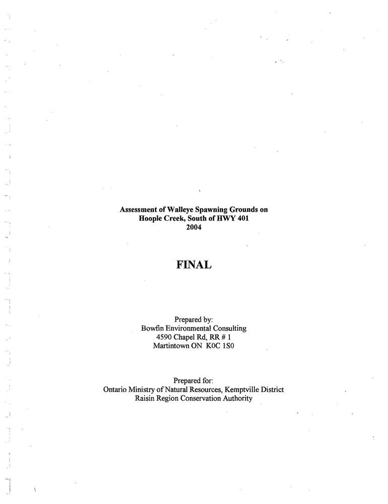 | 0304 | Assessment of Walleye Spawning Grounds on Hoople Creek, South of HWY 401 2004Final | Bowfin Environmental Consulting | 2004 | Cerlox |