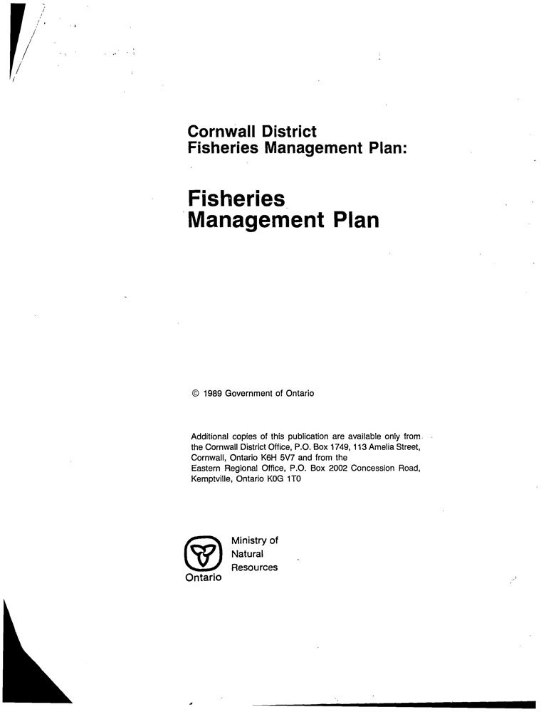 | 0308 | Cornwall District Fisheries Management Plan:Fisheries Management Plan | Government of Ontario | 1989 | Paper clip |