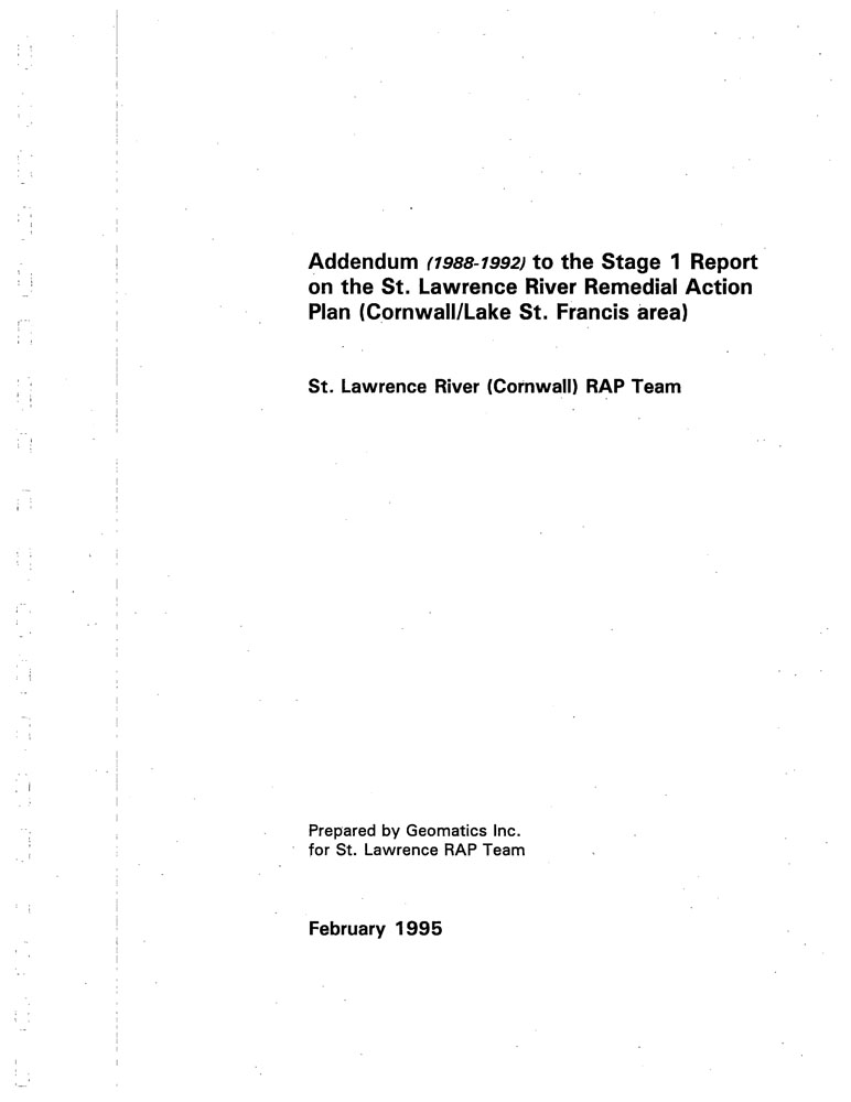 | 0309 | Addendum to Stage 1 ReportSt. Lawrence River Remedial Action Plan, Cornwall/Lake St. Francis Area | Geomatics Inc | 1995 | Cerlox |