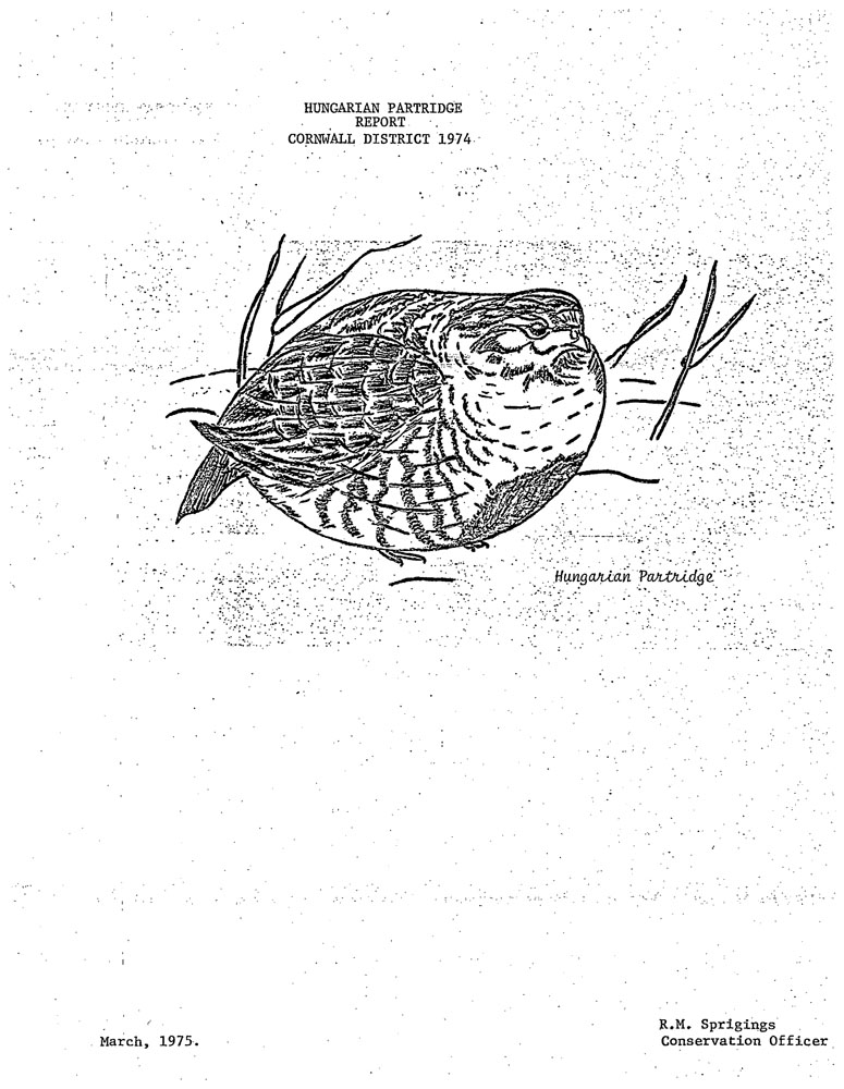 | 0310 | Hungarian Partridge ReportCornwall District 1974 | R.M Sprigings | 1975 | Duotang sort of thing |